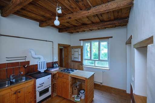 Die Küche ist in den Originalmaßen erhalten und mit Gasherd, Sparherd, Sitzplatz und Vorrichtungen für Kühl-, Tiefkühlschrank und Geschirrspüler ausgestattet. Über dem Essplatz gibt es eine entzückende Nische für Lieblingsdinge.
