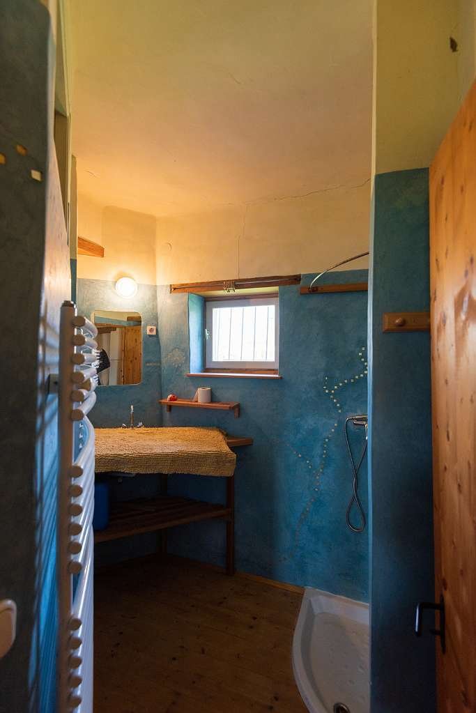 Das neu errichtete Badezimmer, ausgestattet mit Dusche, Waschbecken und einer Gastherme für Warmwasser und Zentralheizung wurde klein gehalten. Für eine angenehme Atmosphäre sorgen die mit Tadelakt gestaltete Wandtechnik und der Holzfußboden.