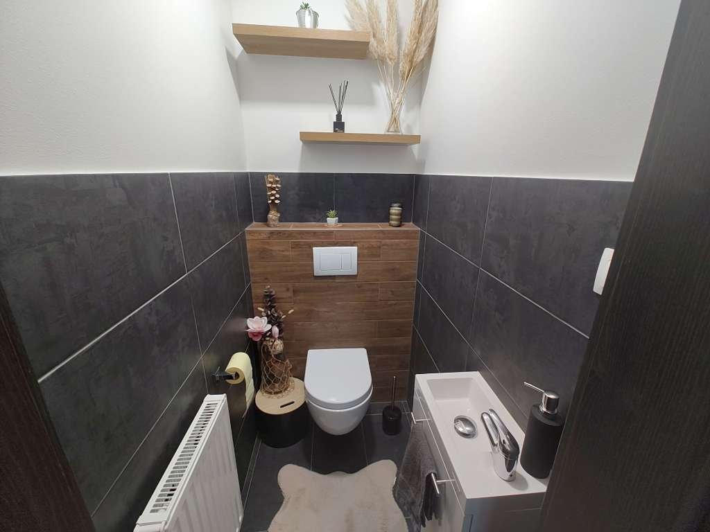 Das Hauptschlafzimmer bietet einen praktischen, separaten Garderobenraum. Das Bad bietet eine breite, barrierefreie Dusche und eine bequeme Wanne sowie ein Waschtisch. Die Toilette ist in einem extra Raum untergebracht. Dazu kommt ein Hauswirtschaftsraum und ein kleines Gäste-/Kinderzimmer oder Homeoffice.
