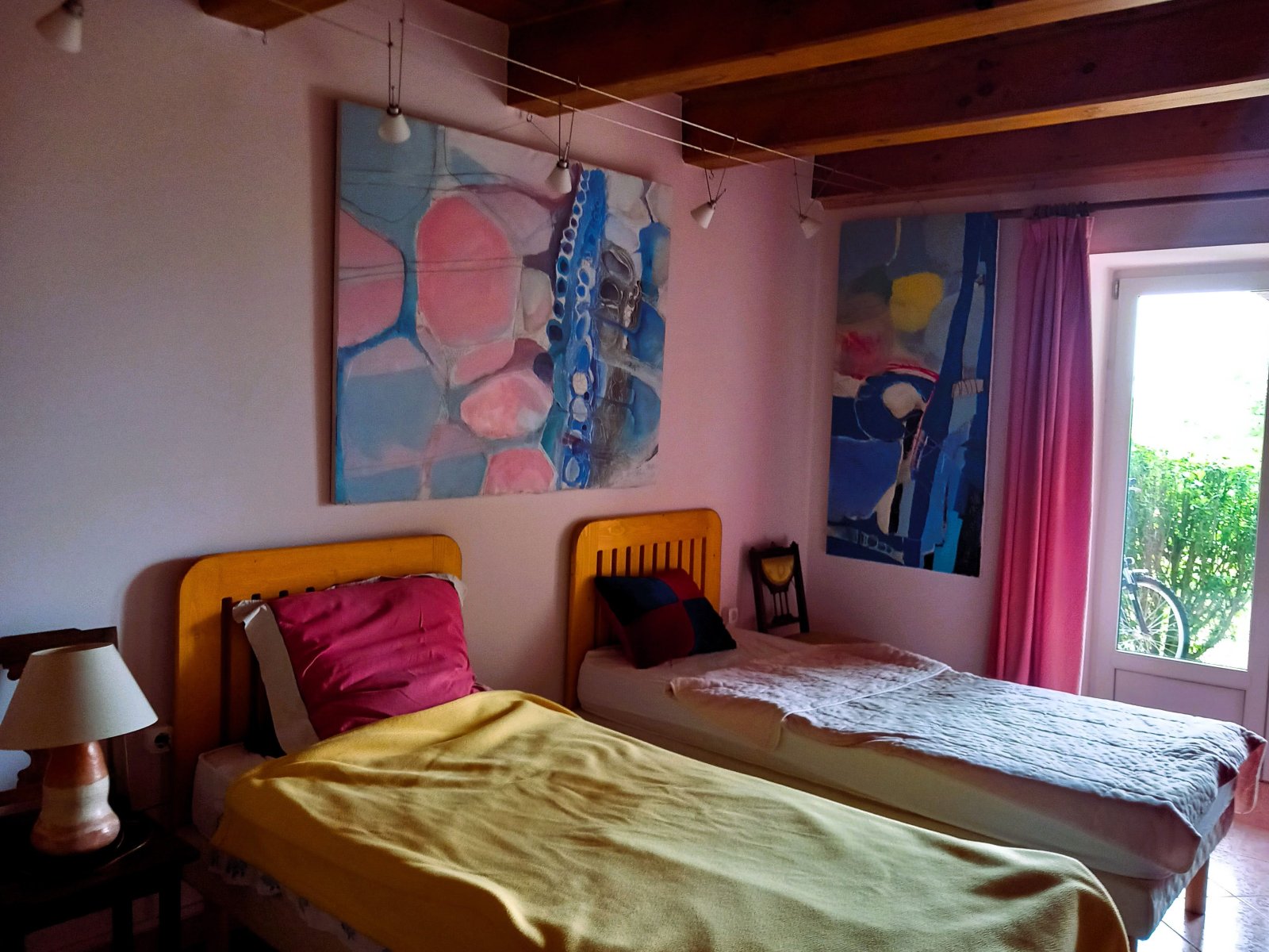 Die Räume im Untergeschoss: ein großzügiges Doppelzimmer mit Terrassenzugang, ein Badezimmer mit Dusche, ein Atelier und Abstellräume, die in Zukunft möglicherweise auch andere Funktionen erhalten. Über eine stabile, bequeme Holztreppe erreichen wir das Obergeschoss, wo sich ein großzügiges Wohnzimmer mit Doppelglastür, ein gemütlicher Flur, ein großzügiges Schlafzimmer, ein Badezimmer mit Badewanne und eine Wohnküche befinden.