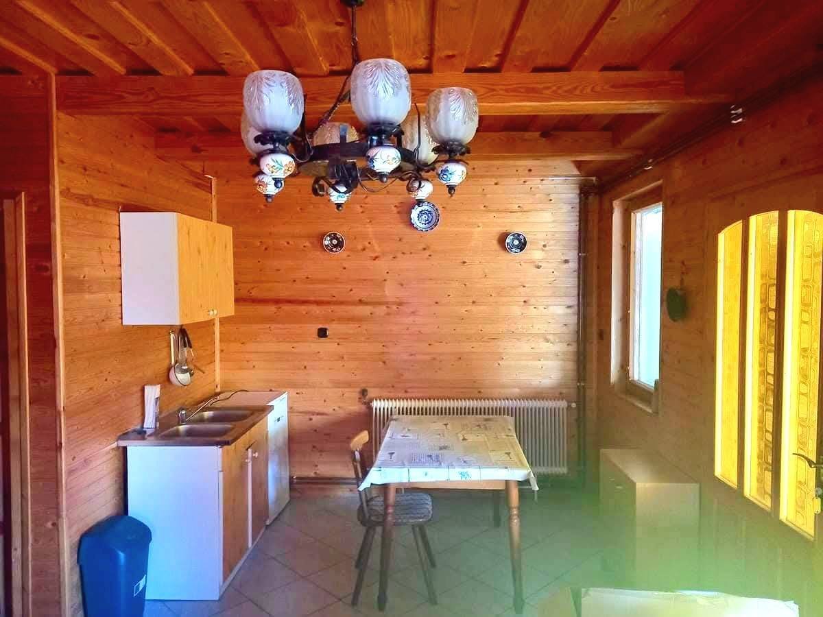 Gemütliche Holzvertäfelung und überdachte Terrasse in der Natur, ruhige Atmosphäre
