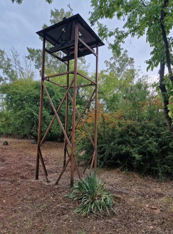 Am Grundstückseingang steht noch immer der Glockenturm, an welchem sich seinerzeit die Schulglocke befand.