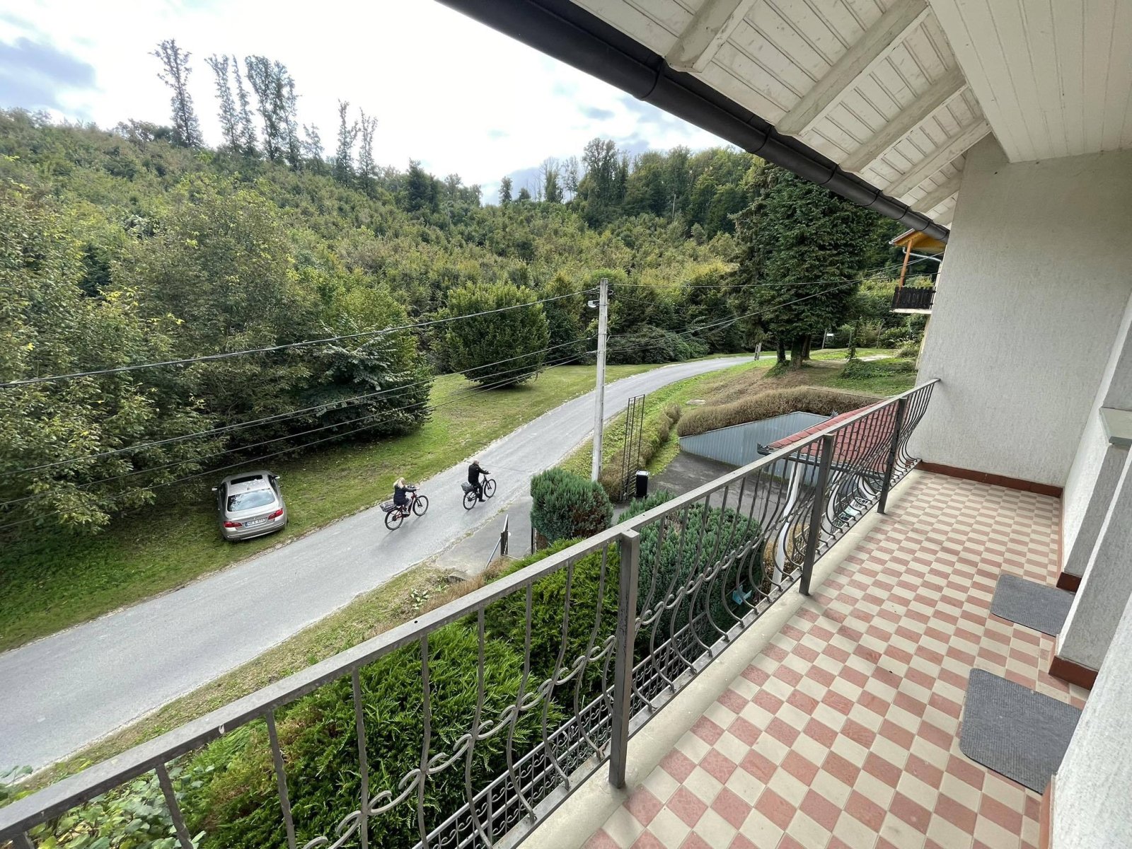 Im Obergeschoss befinden sich eine Büroecke, ein Flur, zwei Schlafzimmer (eines davon mit Balkon und Blick auf den Wald), ein Gäste-WC und ein weiteres Badezimmer mit WC.