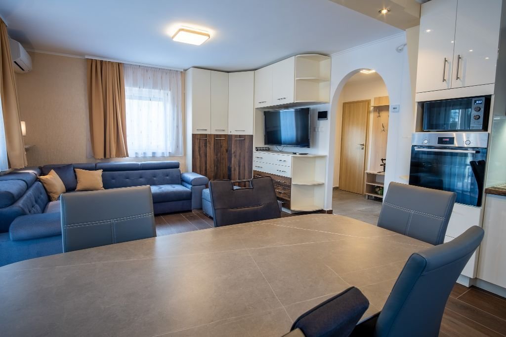 Sowohl von den Schlafzimmern als auch vom Wohnzimmer aus haben Sie Zugang zu den Terrassen. Die Unterkunft bietet Platz für 8+2 Personen.