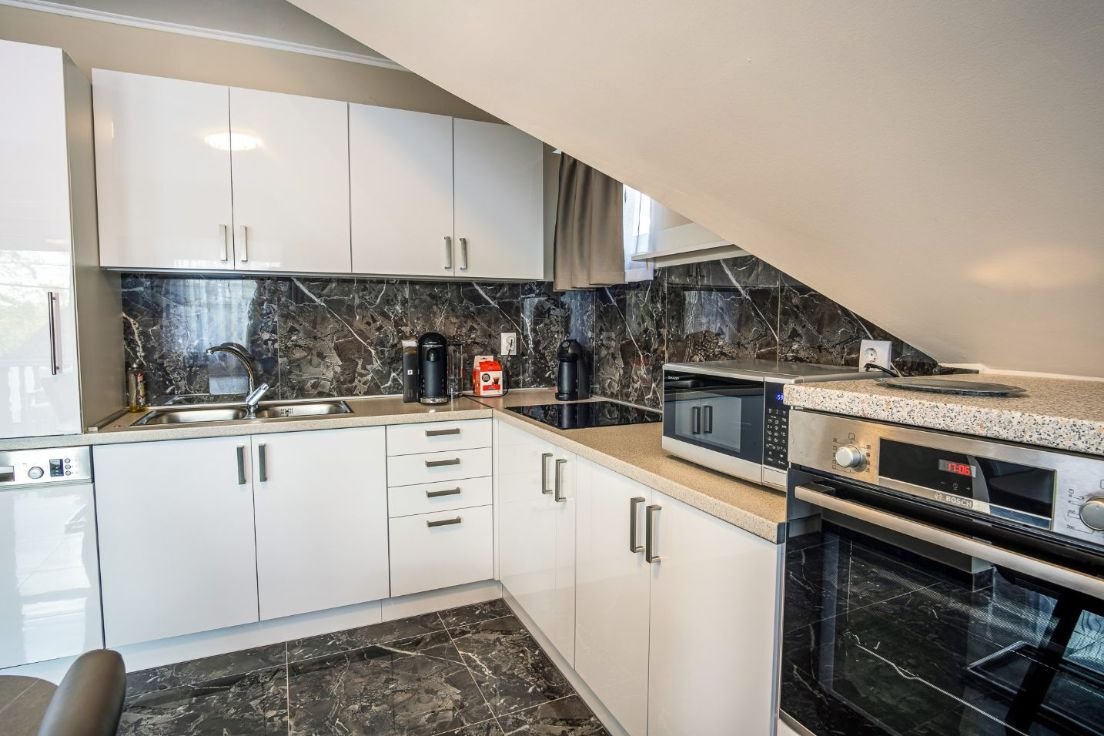 -eine voll ausgestattete Küche (Kühlschrank, Backofen, Herd, Mikrowelle, Kapselkaffeemaschine, Toaster, Wasserkocher, komplettes Besteck),