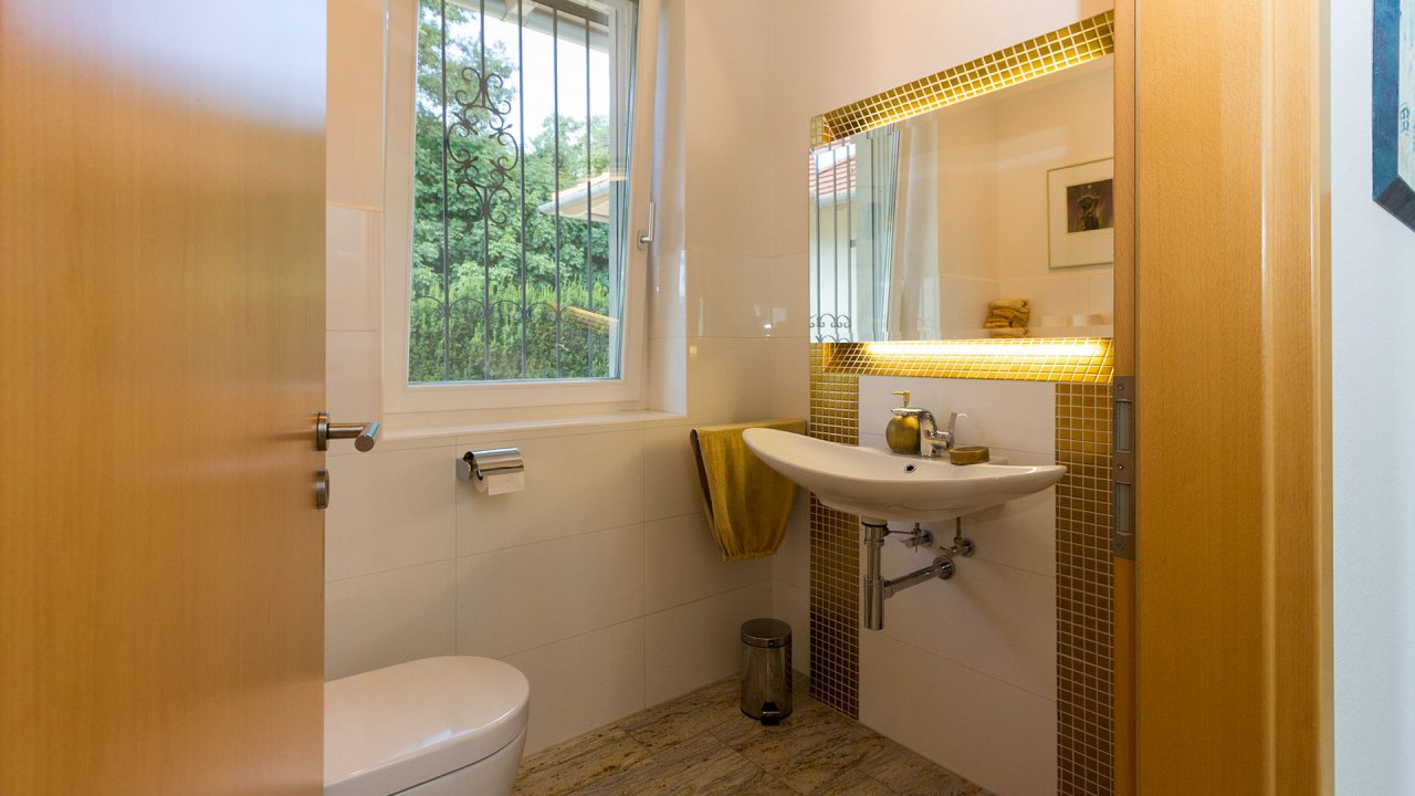 Another plus point of this exclusive property is the guest toilet and the two kitchens - a fitted kitchen (EBK) and an open-plan kitchen. Here you can develop your culinary arts and at the same time enjoy the beautiful lake view. The luxurious furnishings of the house leave nothing to be desired.