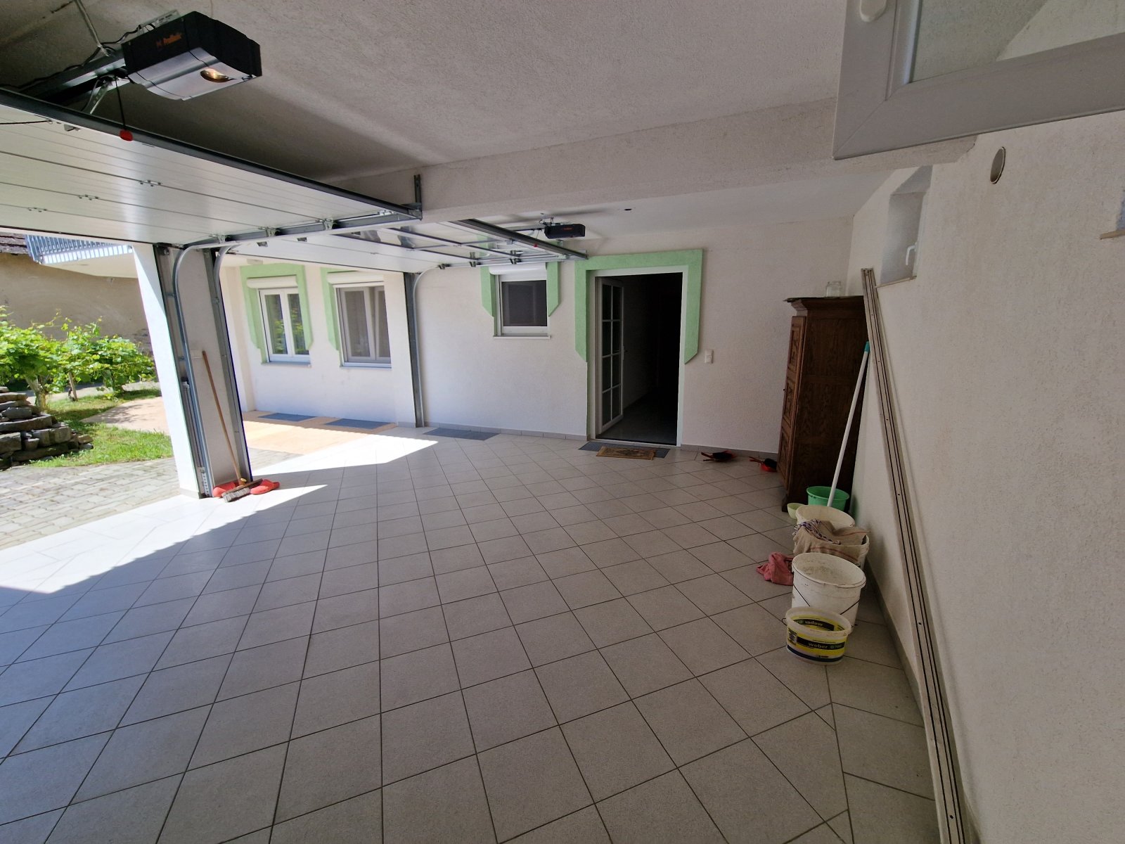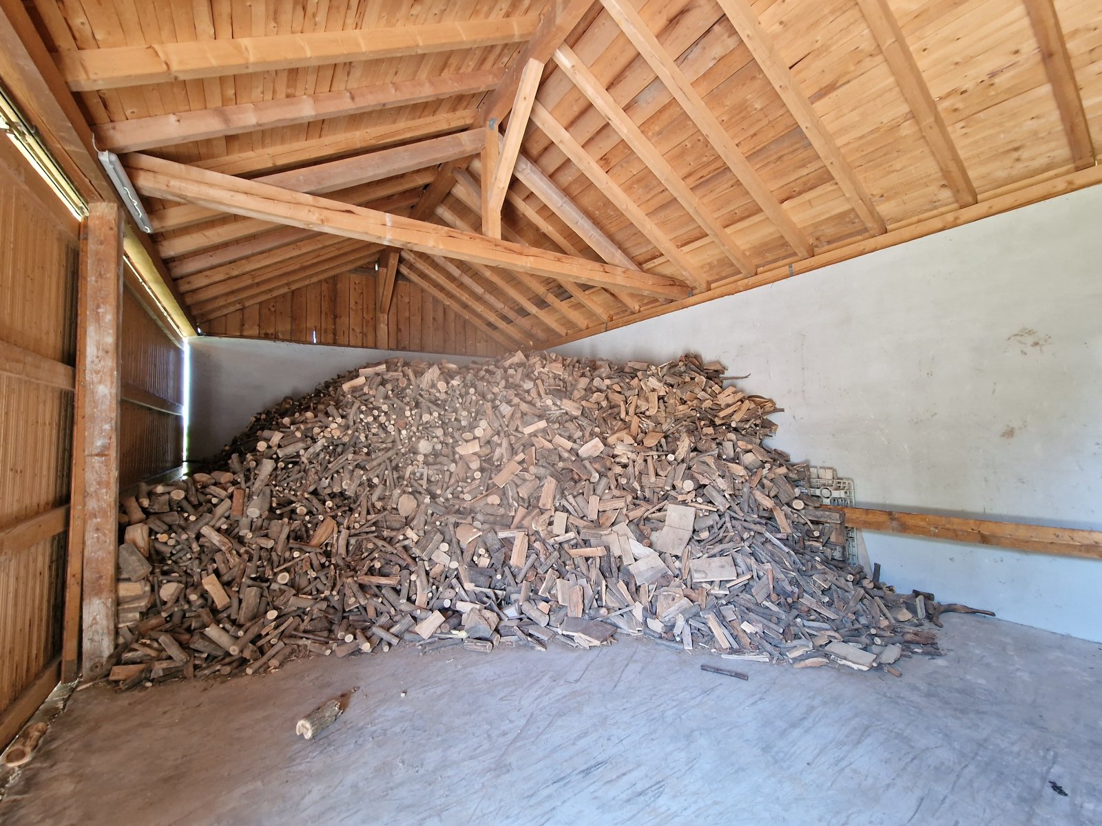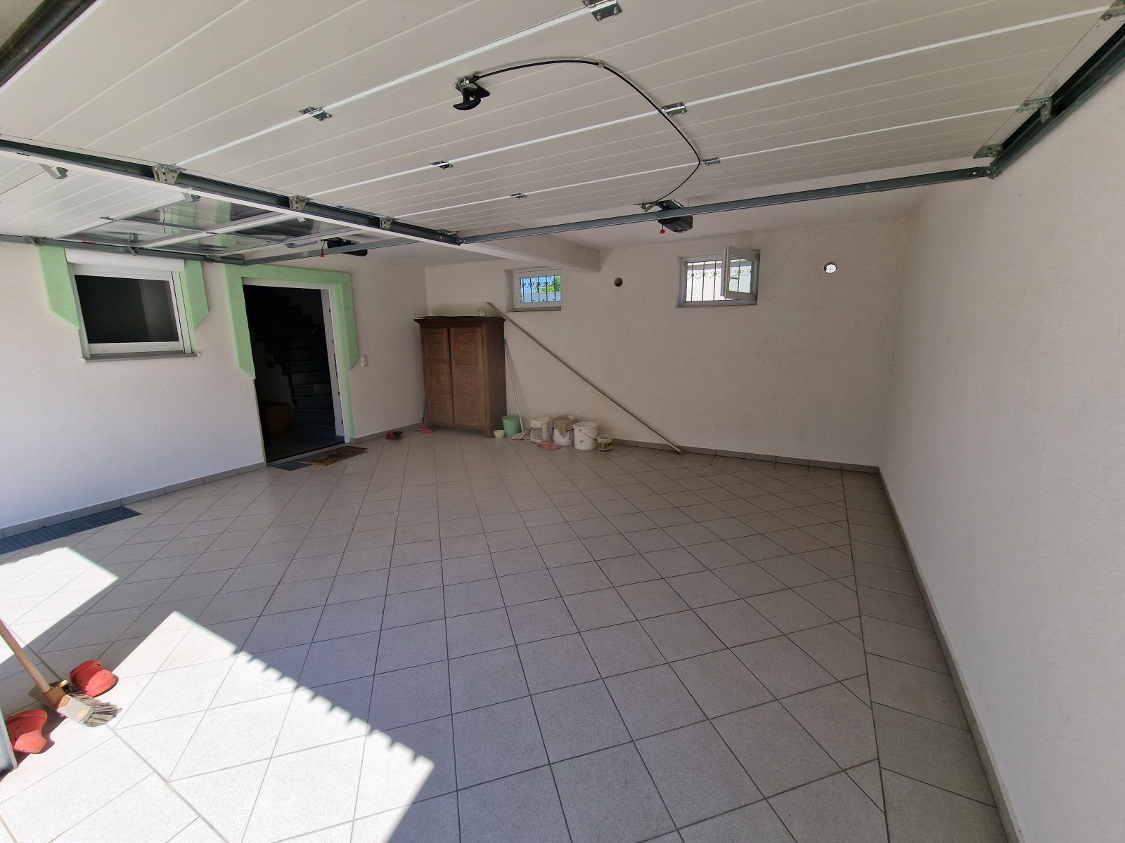 A wooden staircase leads to 2 further rooms and a toilet in the attic. The entire house has a basement of approx. 111m². In the basement there are several rooms, a boiler house and a wood store with wood disposal from the yard. A brick outbuilding with a concrete floor and approx. 65m² adjacent to the granny flat is currently used as a wood storage area. The property includes a double garage and another garage with storage room and entrance to the house.