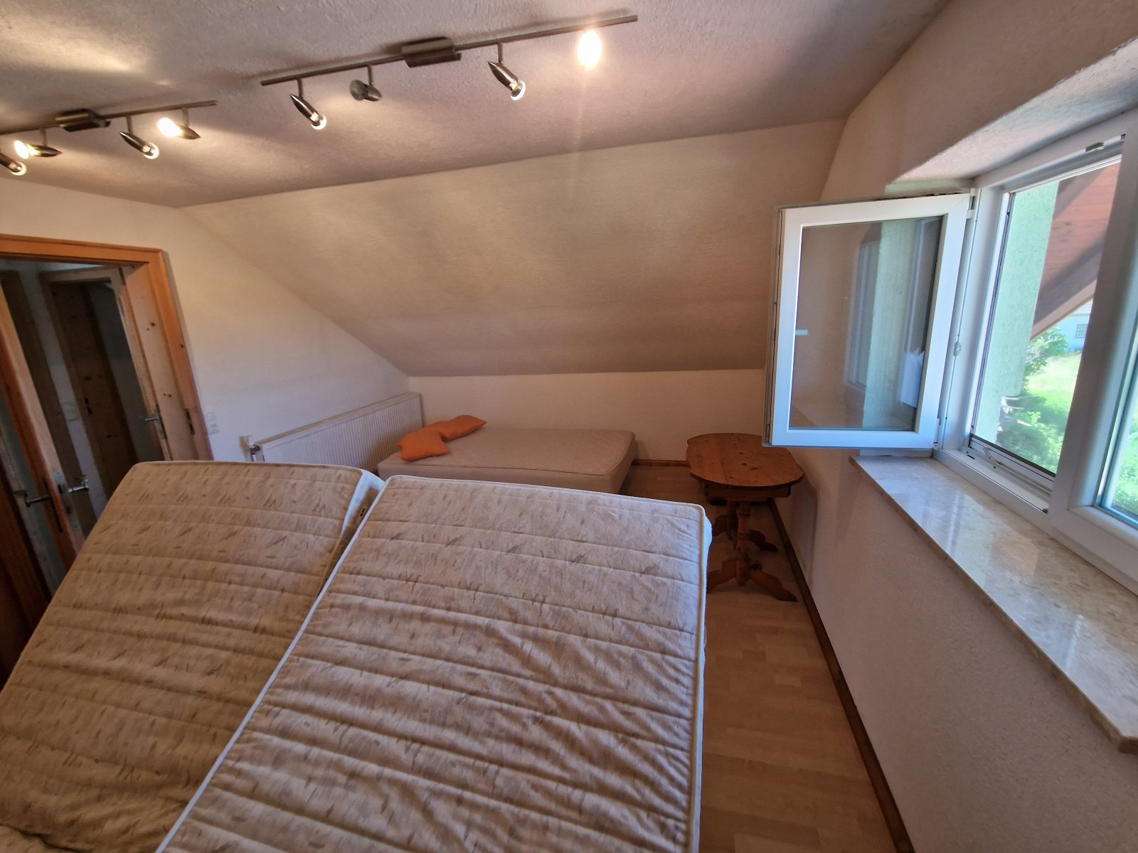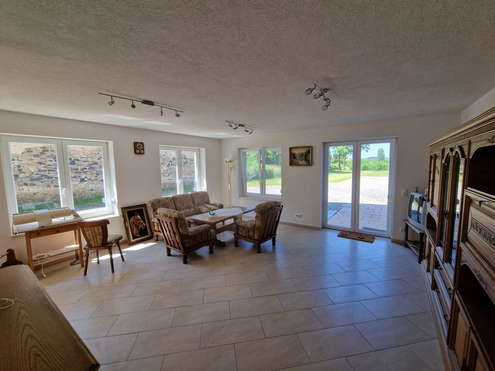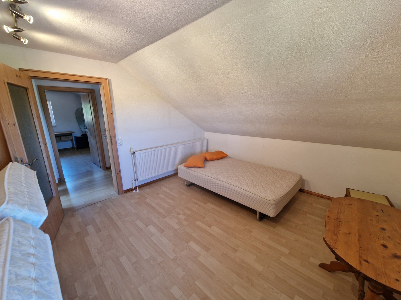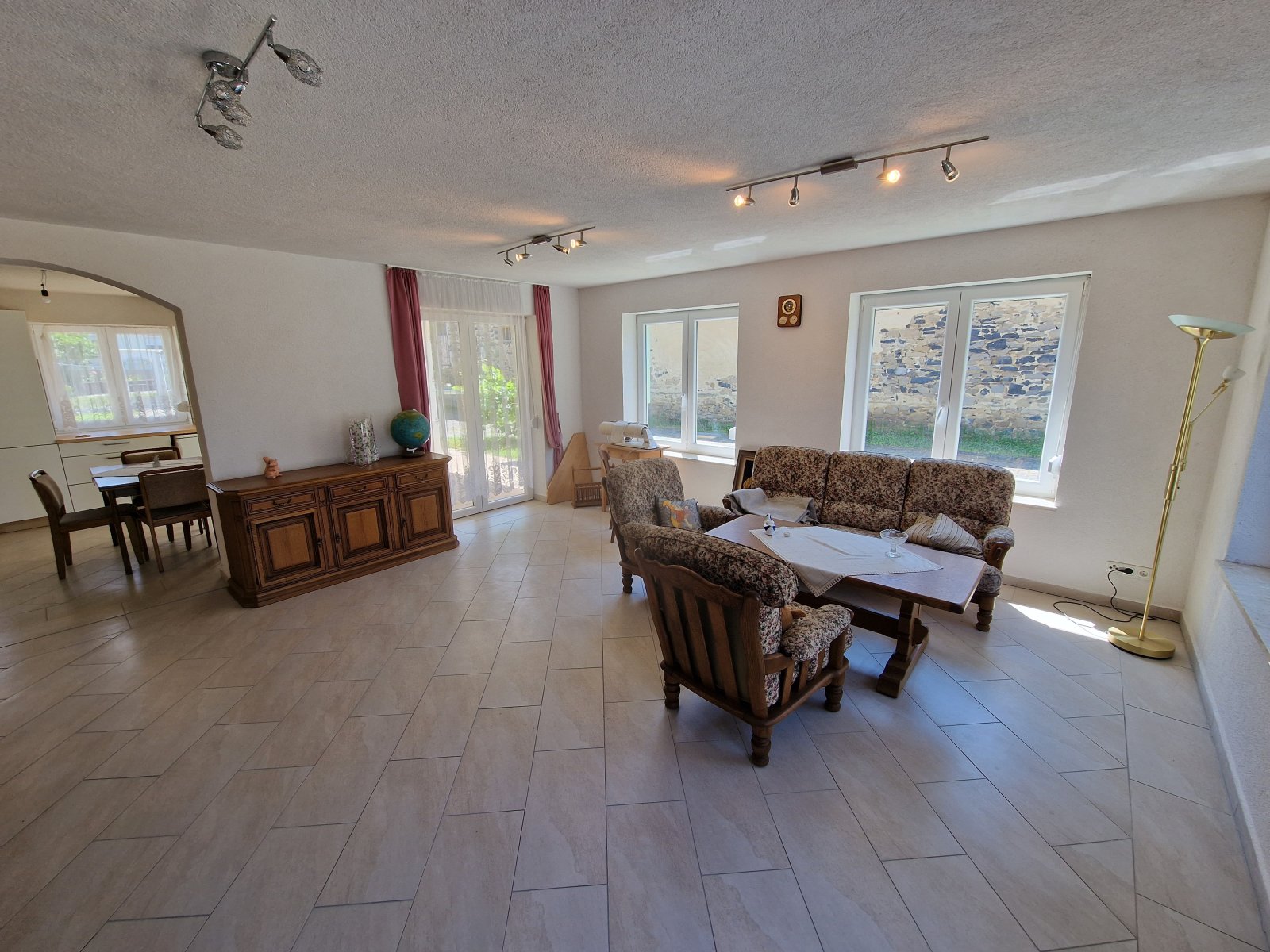 A wooden staircase leads to 2 further rooms and a toilet in the attic. The entire house has a basement of approx. 111m². In the basement there are several rooms, a boiler house and a wood store with wood disposal from the yard. A brick outbuilding with a concrete floor and approx. 65m² adjacent to the granny flat is currently used as a wood storage area. The property includes a double garage and another garage with storage room and entrance to the house.