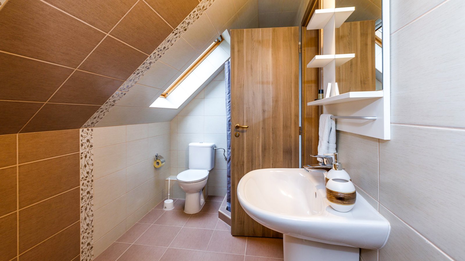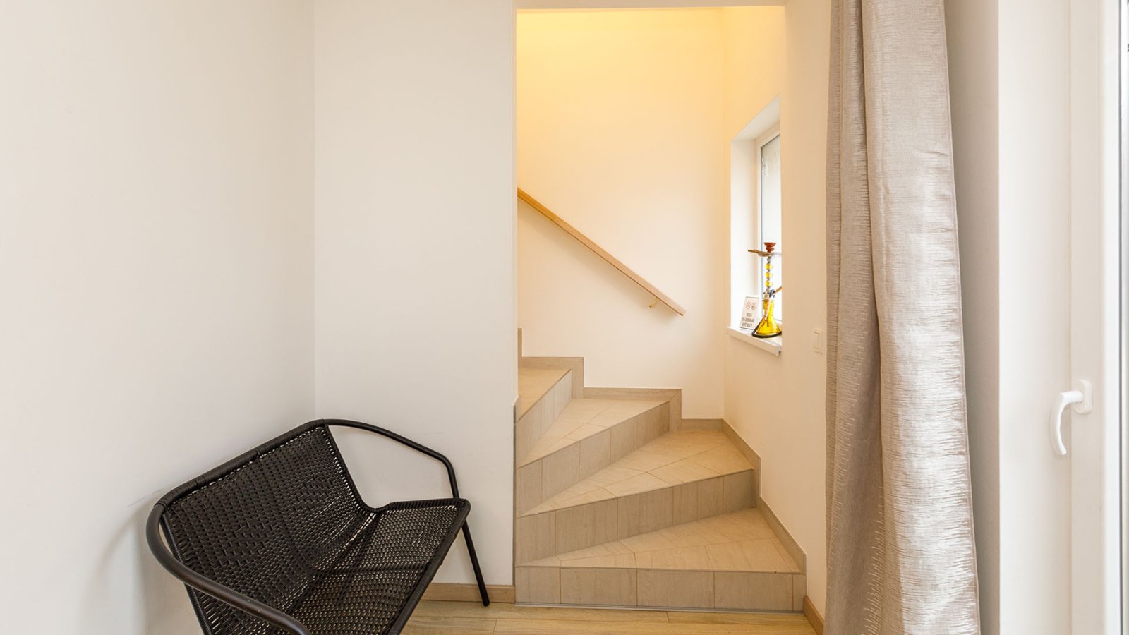 Upstairs there are two bedrooms and a bathroom, ensuring private living space. The rooms are spacious and well designed, the bathroom is modern.