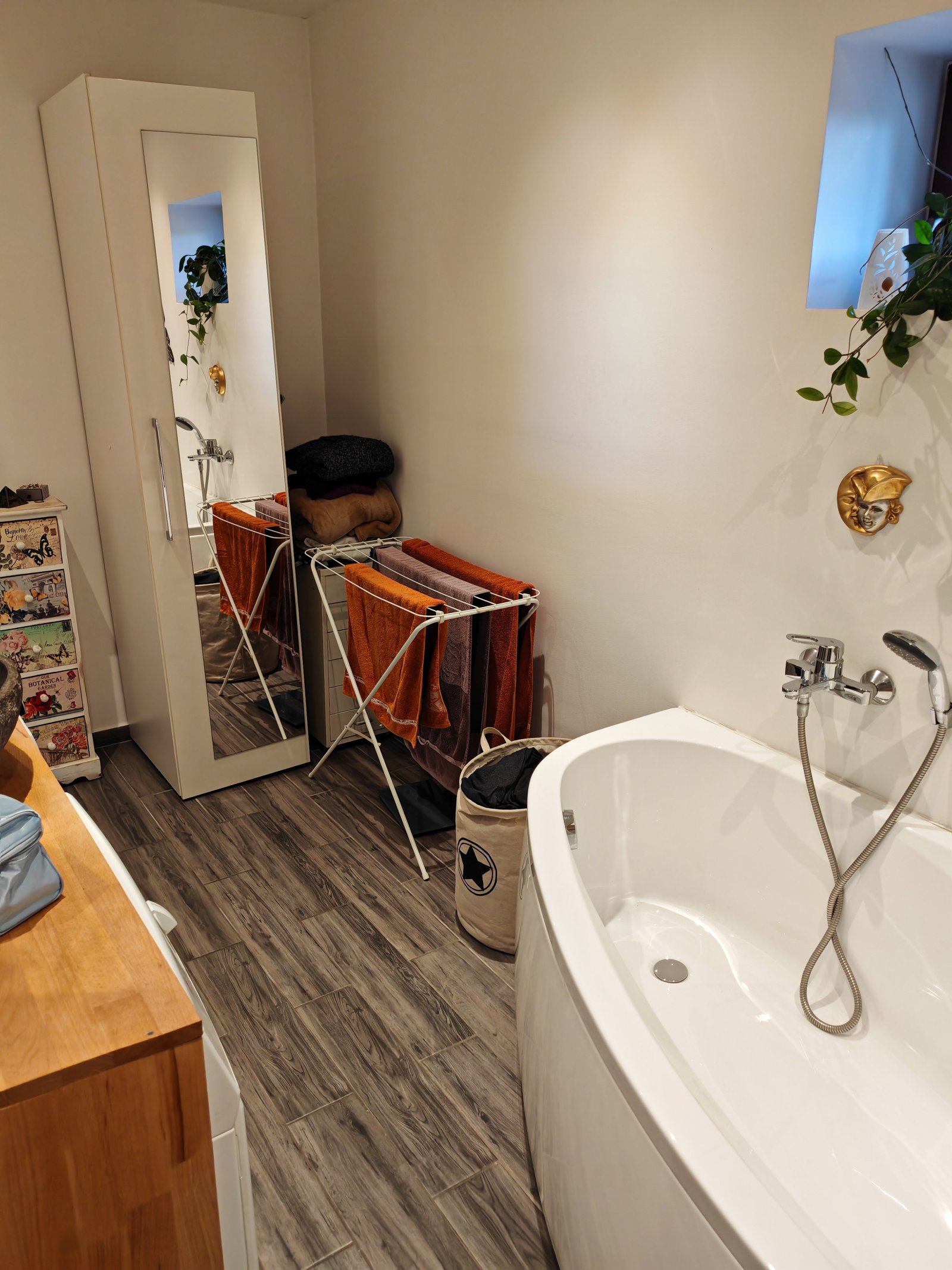 Many extras such as underfloor heating, two infrared heating panels, solid oak flooring, extended power supply, new sewage pit/Wilo, air/heat pump including 2 air conditioning and heating devices for the attic area, satellite TV connection and a garage are also part of the upscale equipment.