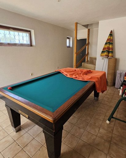 The entrance area of the house also features a garage and a large summer kitchen with its own access to the terrace. Two separate multi-purpose rooms with billiards and table tennis tables, as well as fitness equipment, expand the recreational offerings. Two large attic rooms are also available.
