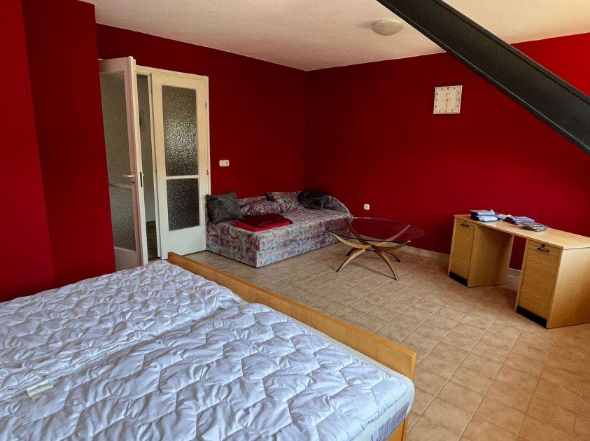 The upper floor offers two additional bedrooms, a kitchen, a living room, a bathroom with a toilet, as well as an office, an ironing room with an ironing press, and a spacious storage room.