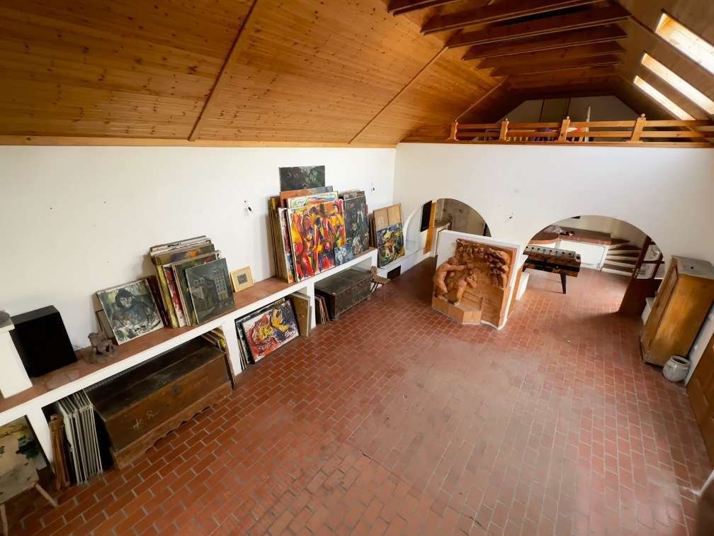 This romantic artist's house combines southern flair with plenty of space for ideas. The centerpiece is the spacious studio (approx. 130 m²) – open, bright, and perfect for painting, sculpture, yoga, workshops, or small concerts. Three handcrafted tiled stoves and an open fireplace create atmosphere; two daylight bathrooms plus guest toilets make everyday life comfortable. The two towers, a vine-covered pergola, and the lovingly landscaped rose and orchard give the house its unmistakable signature.