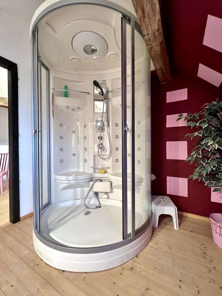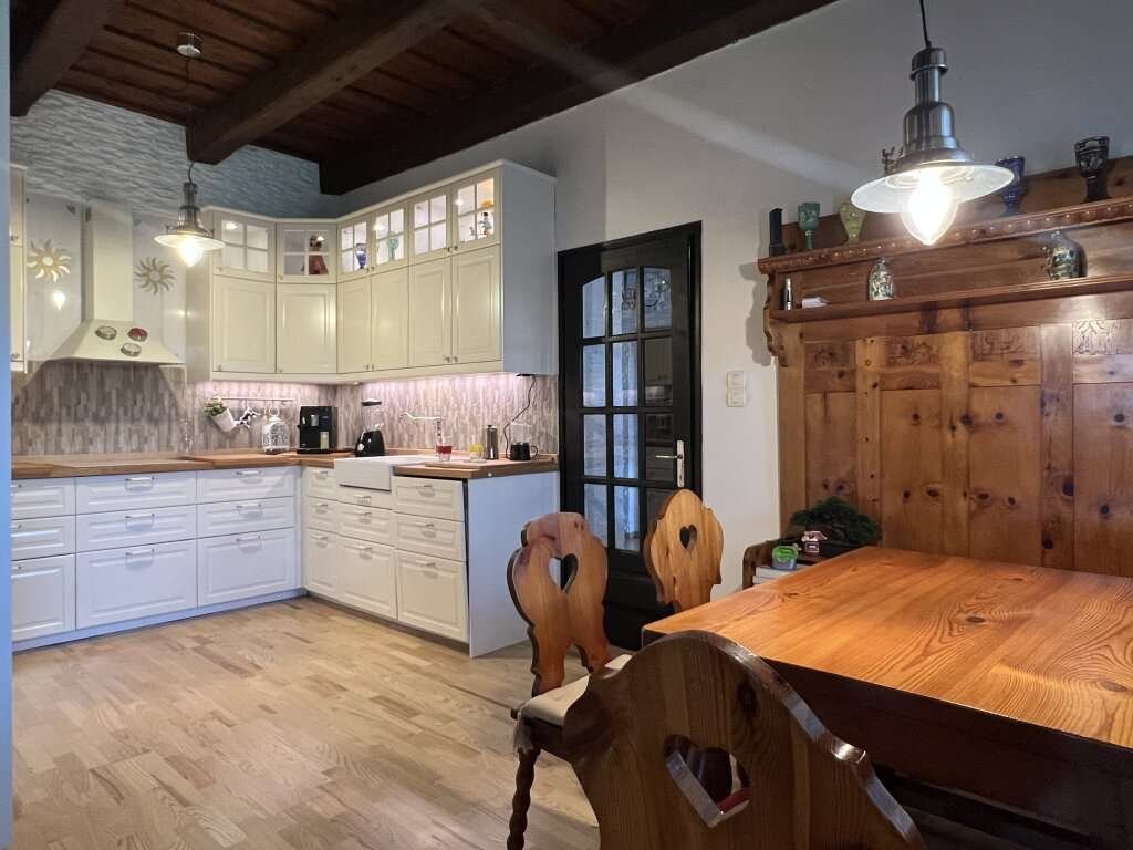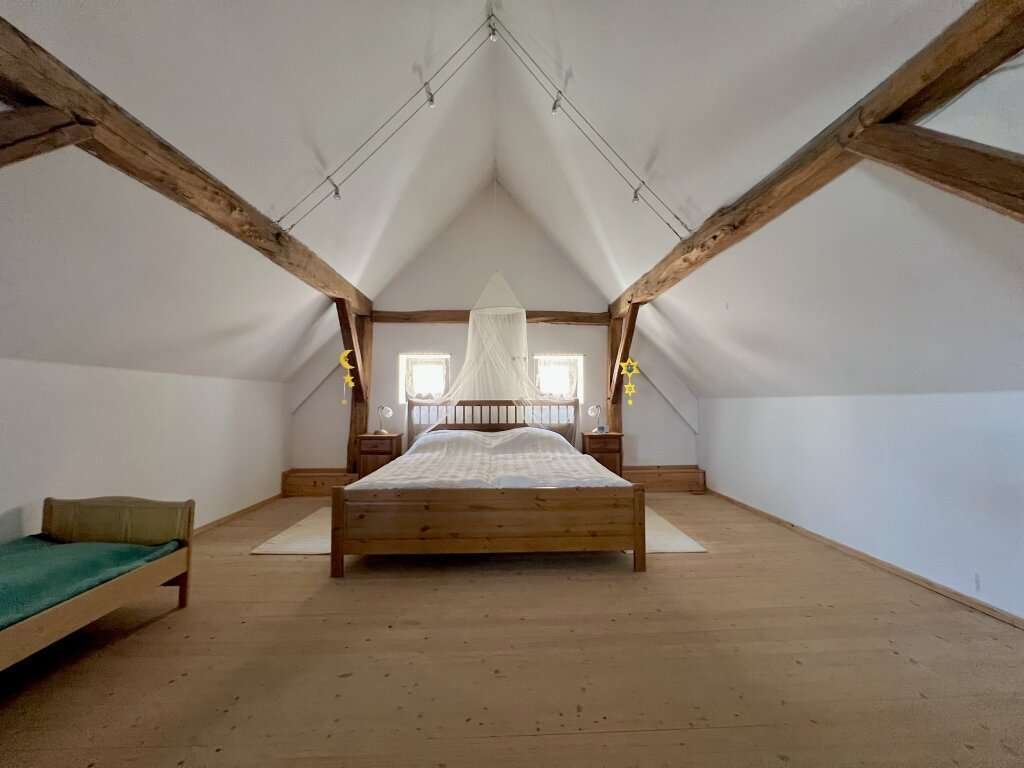 In addition, there is a fully equipped workshop of approximately 100 m² (high-voltage power available!) with an adjoining room and a room above it in the converted attic.