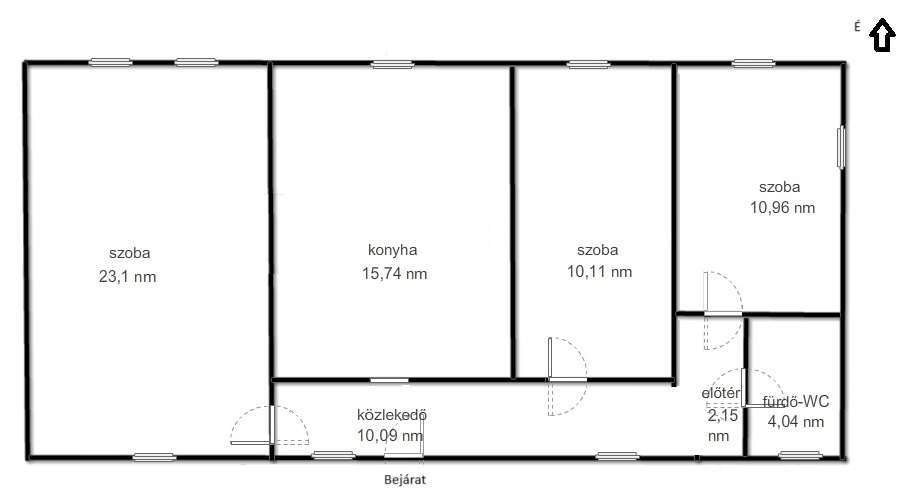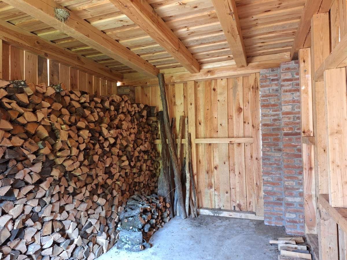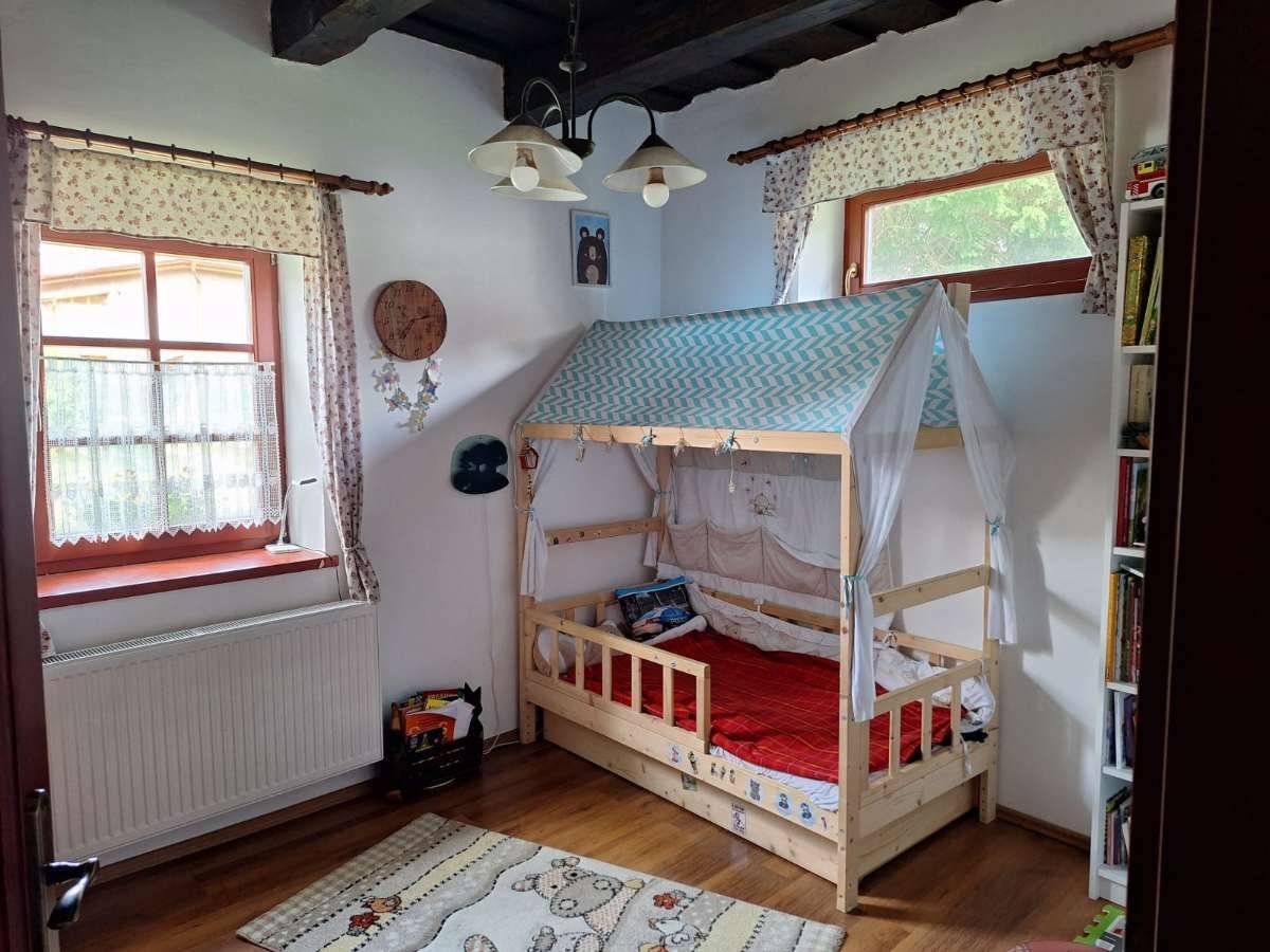 In the hallway, facing east, there are two additional bedrooms and the bathroom. Thanks to the 50 cm thick brick walls, the insulated ceiling and floor, the insulated windows, and the functioning solar collector, the house has very low energy requirements. A natural gas line is located on the property, as is electricity.