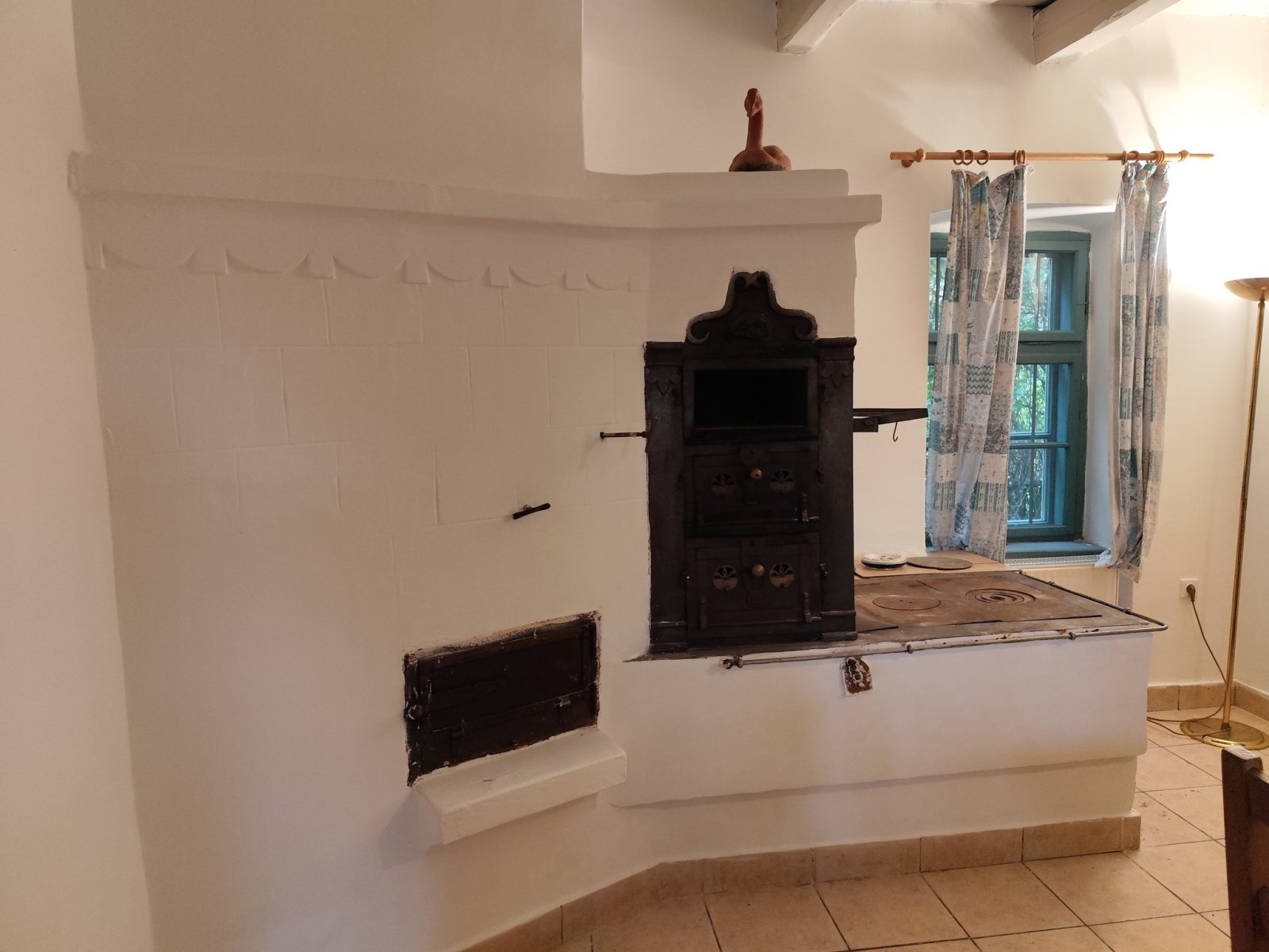 A cozy, traditional stove has been preserved in the kitchen, adorning the room like a true gem. This beautiful stove not only serves a practical function but also embodies the history and culture of the house.