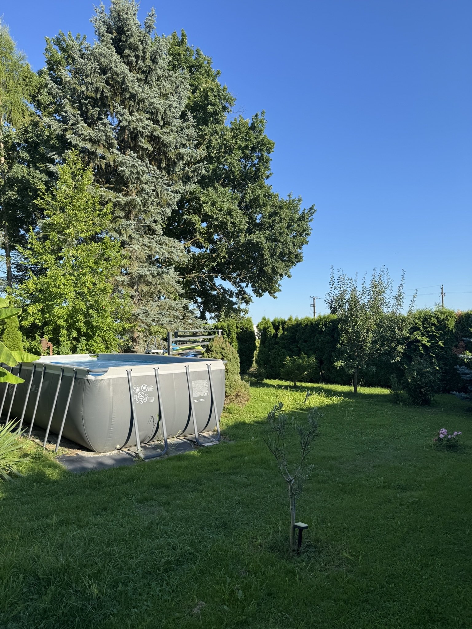 The 1300 m² garden is beautifully landscaped and completely private thanks to a row of thuja trees. There is also a woodshed, a Finnish sauna, and an outdoor pool. Facing the street, the property offers a paved carport for two cars and parking spaces for three to four additional vehicles.