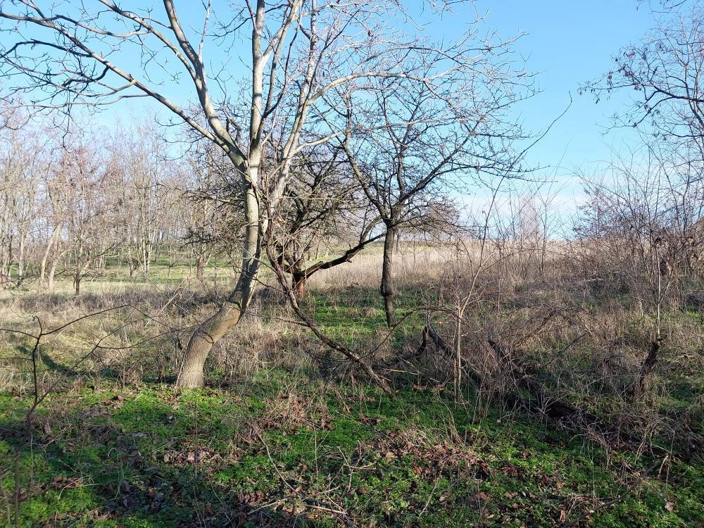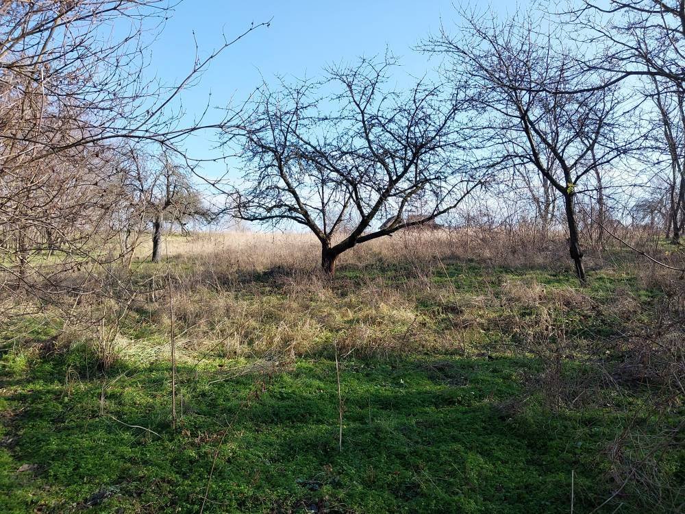 It is mostly covered with grass and contains two cherry trees and a walnut tree. The front part of the plot is level and then slopes down to the southwest.