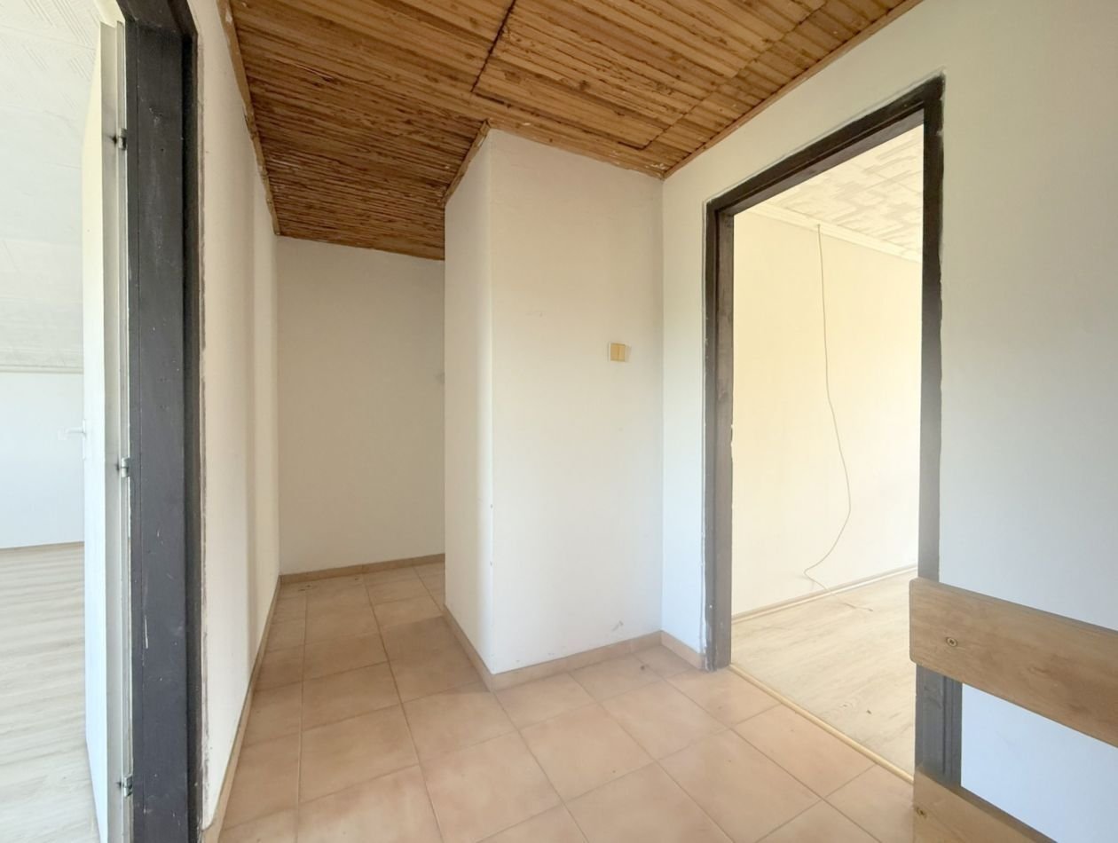 The 73 m² middle floor comprises a hallway, a living room, two bedrooms, a kitchen with a pantry, a staircase, and a central room with access to the terrace. The bathroom on this level was renovated six years ago, and the gas boiler was also replaced.