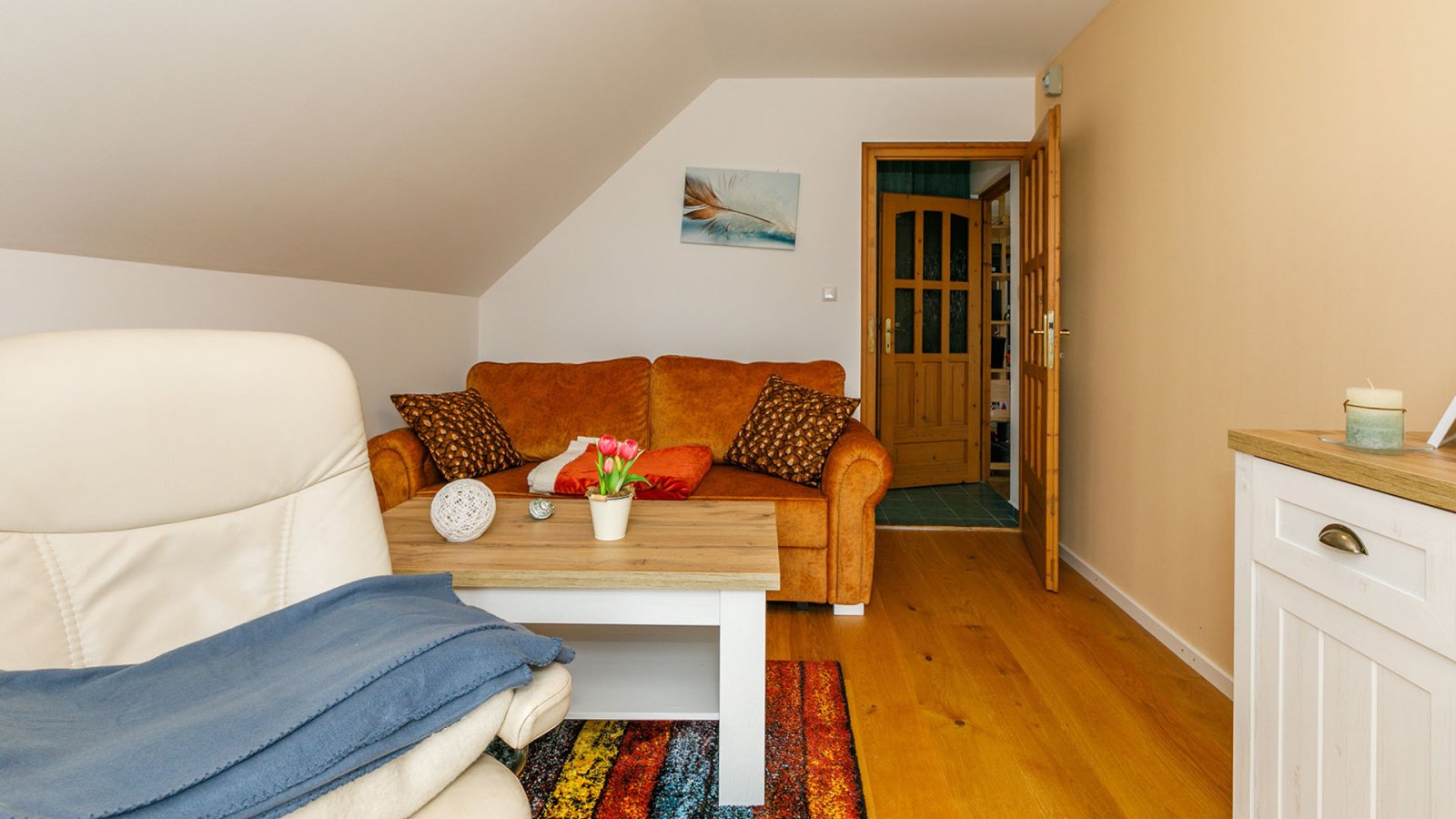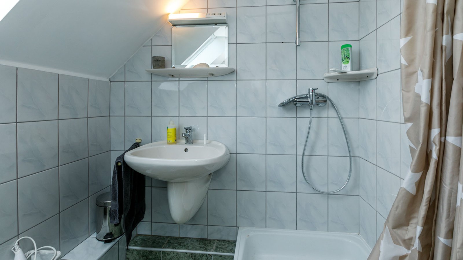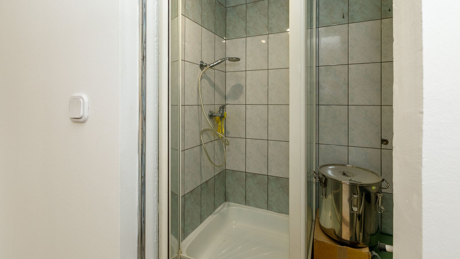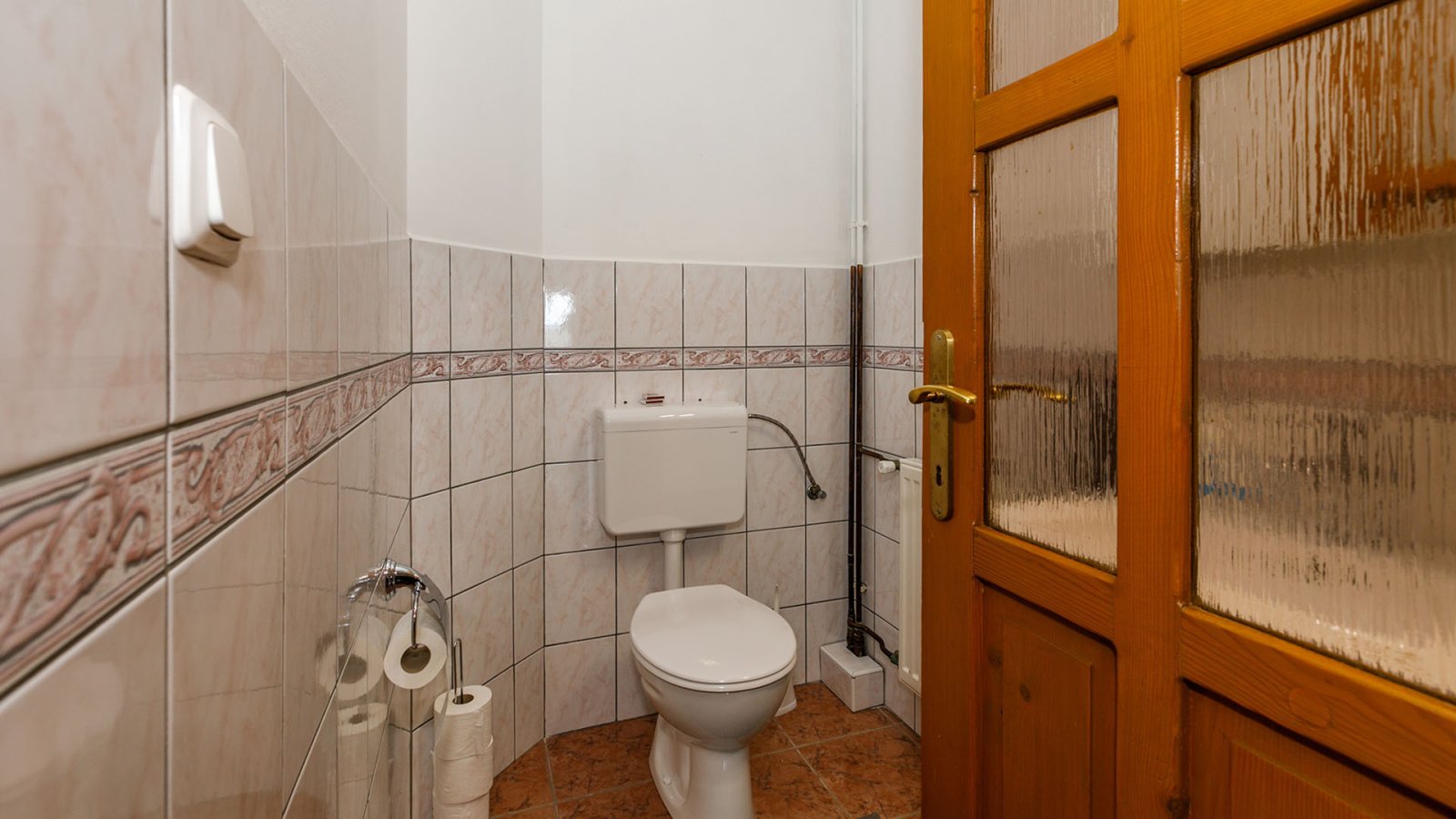 - A guest toilet and the large main bathroom with bathtub and glass shower cubicle are to the left of the entrance