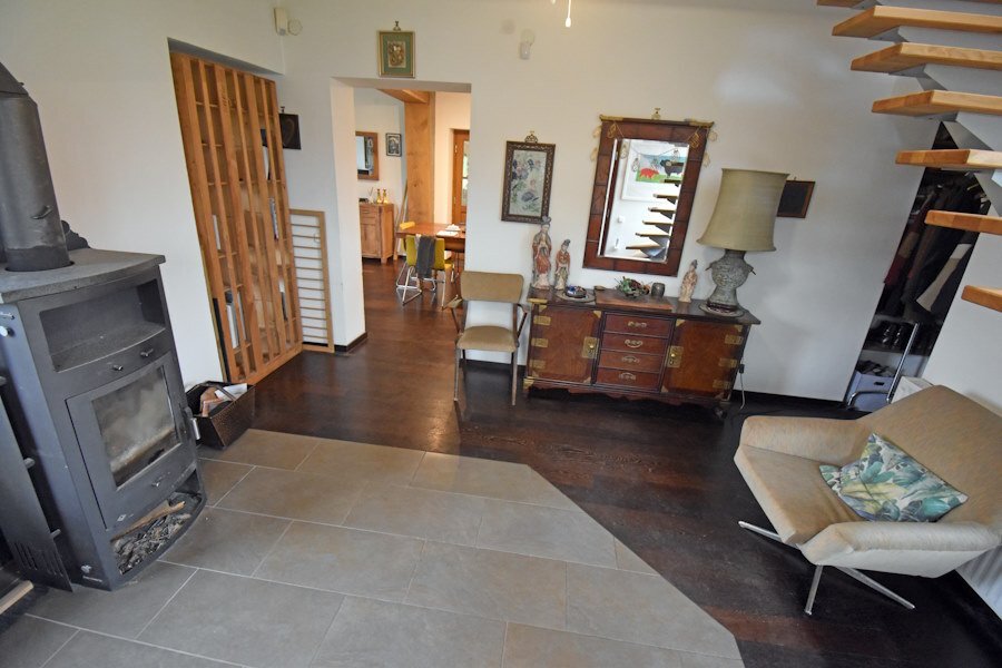 - an entrance hall with a wood-burning stove and an open staircase leading to the attic