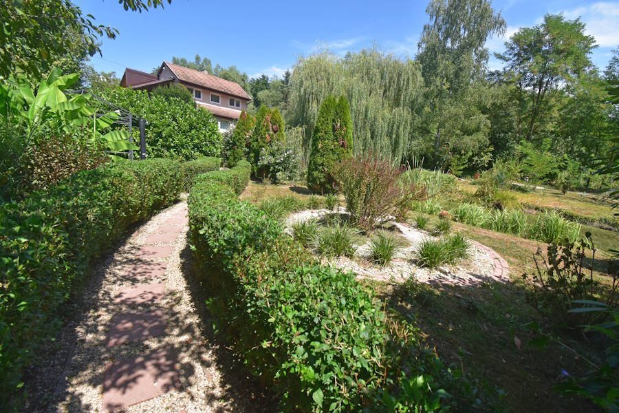 The beautifully landscaped plot is 2,863 m2. The lake on the plot is fed by a stream and a wooden bridge leads to the cozy island. The lake is home to some wild ducks, herons and other water birds.