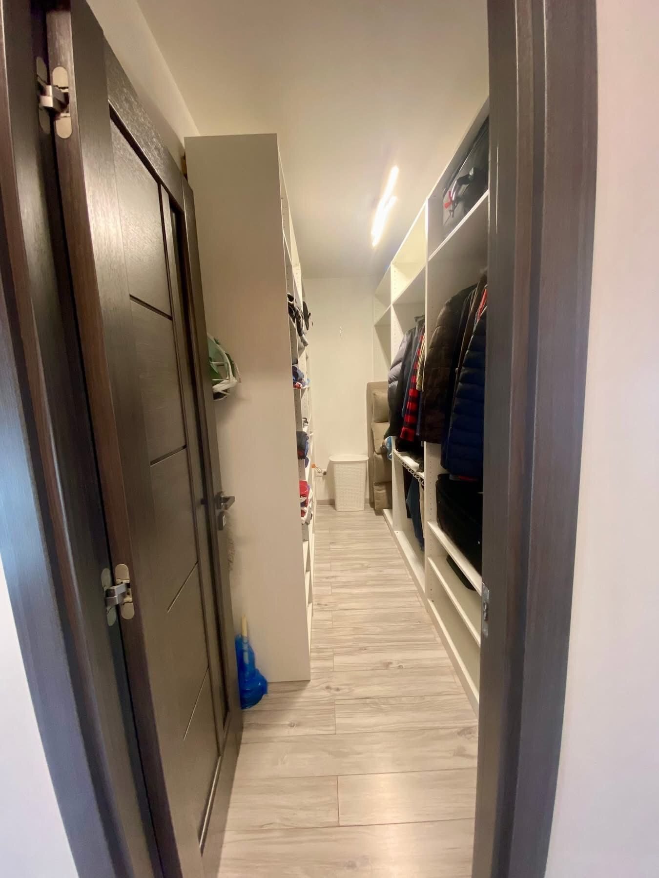 Open-plan living/dining area with large glass front, hallway with built-in wardrobe and wall paneling, bedroom with the option to install a walk-in closet or built-in wardrobe, storage room (currently used as a cloakroom with shelving), bathroom with shower and toilet, spacious covered terrace with blinds