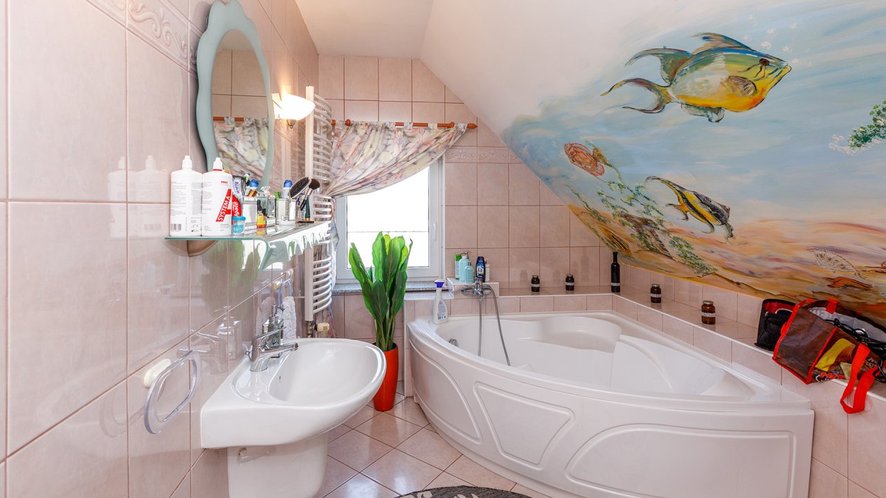En el nivel de vivienda hay un salón-comedor con terrazas panorámicas circulares, en la planta superior hay habitaciones románticas con baños y terrazas. La casa también dispone de calefacción central de gas y estufa de azulejos.