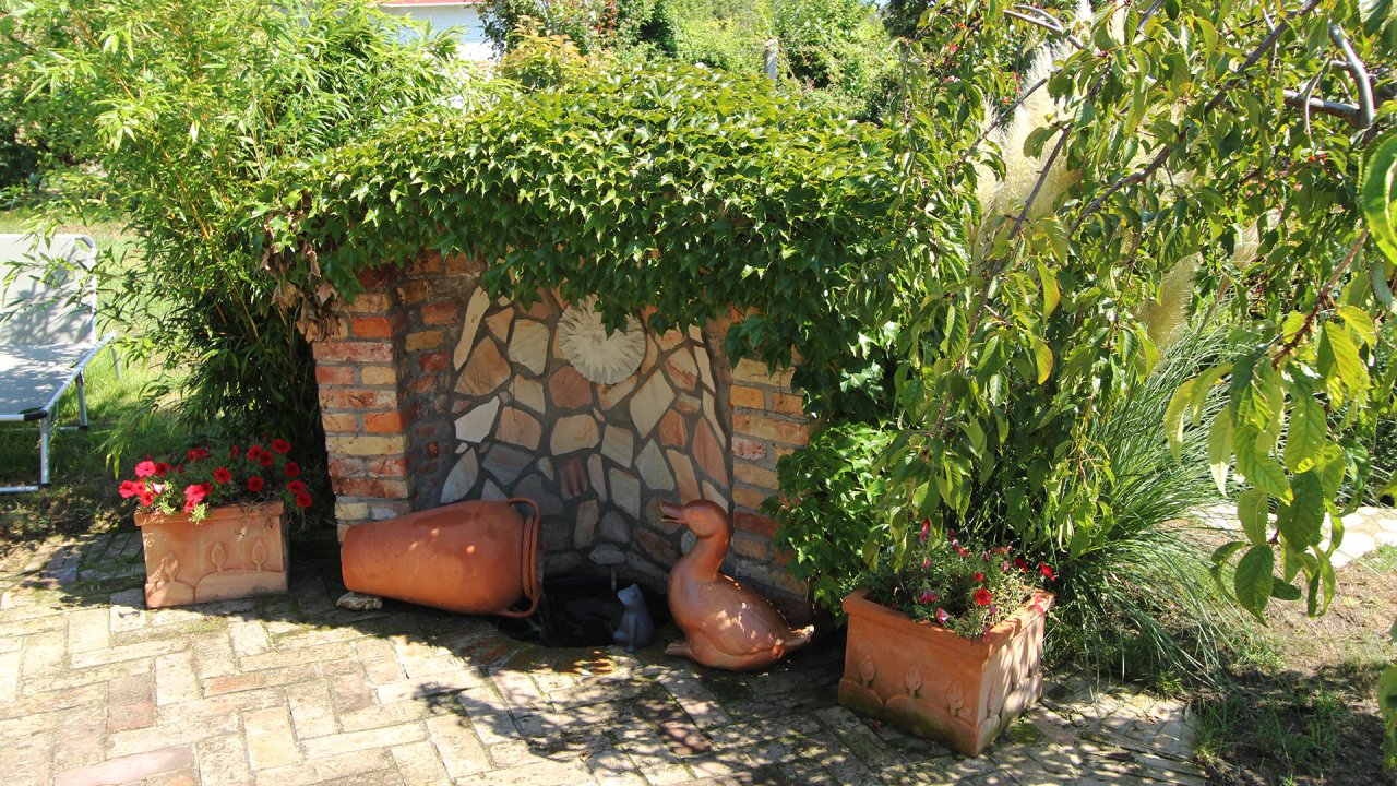 El jardín es una auténtica rareza, lleno de flores, fuentes y alondras.