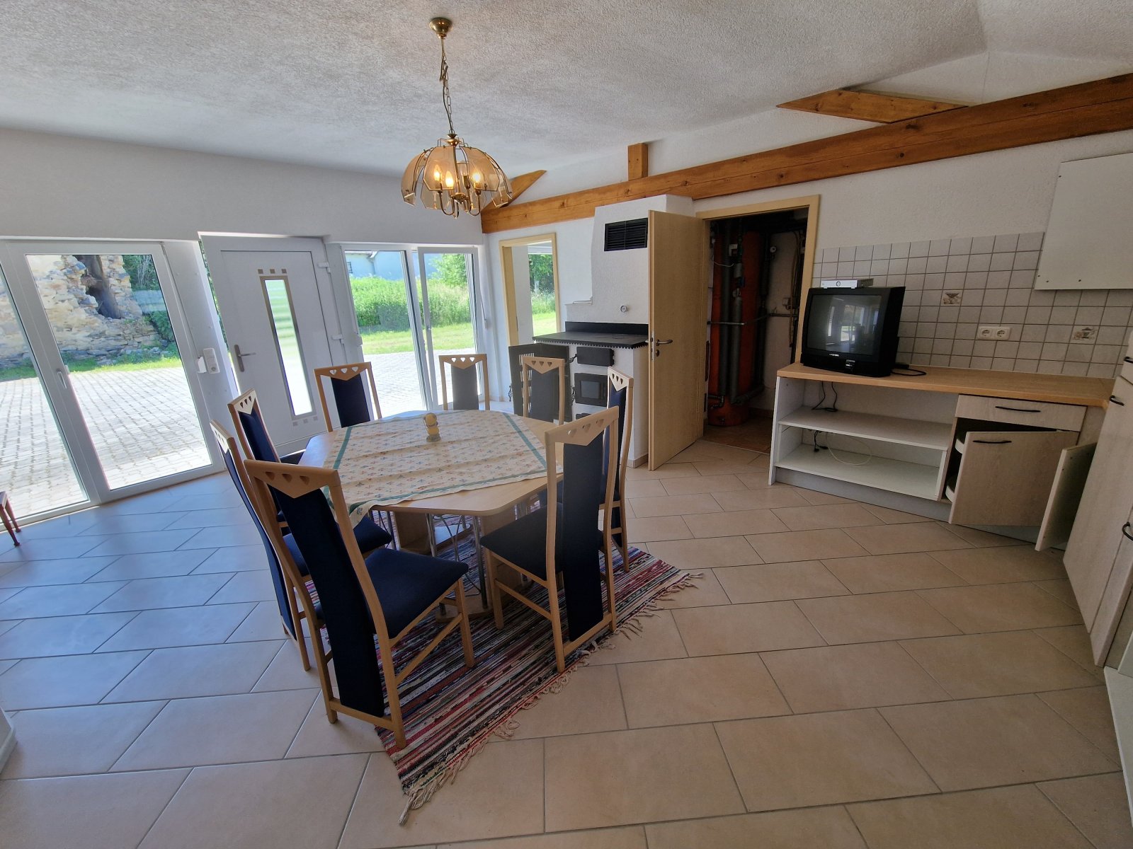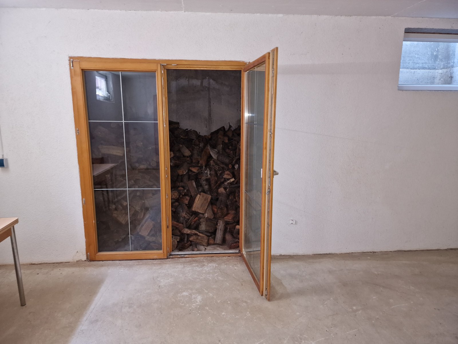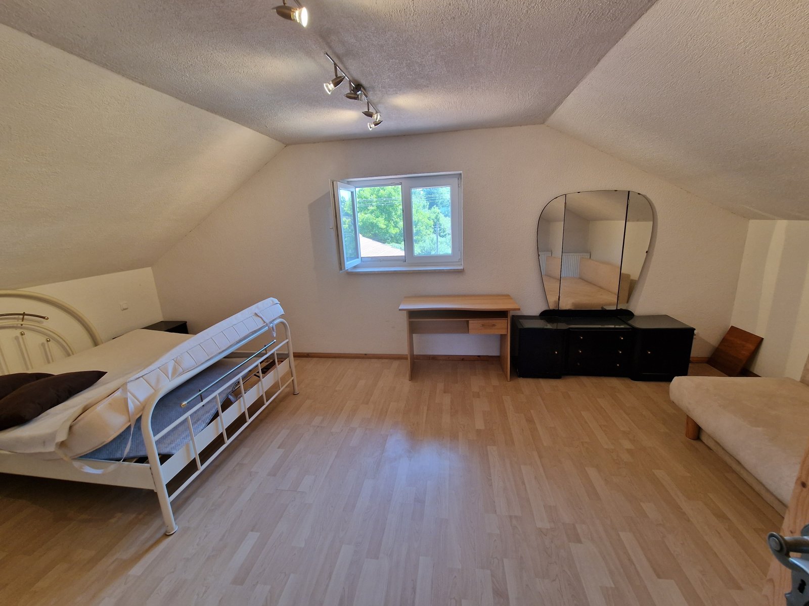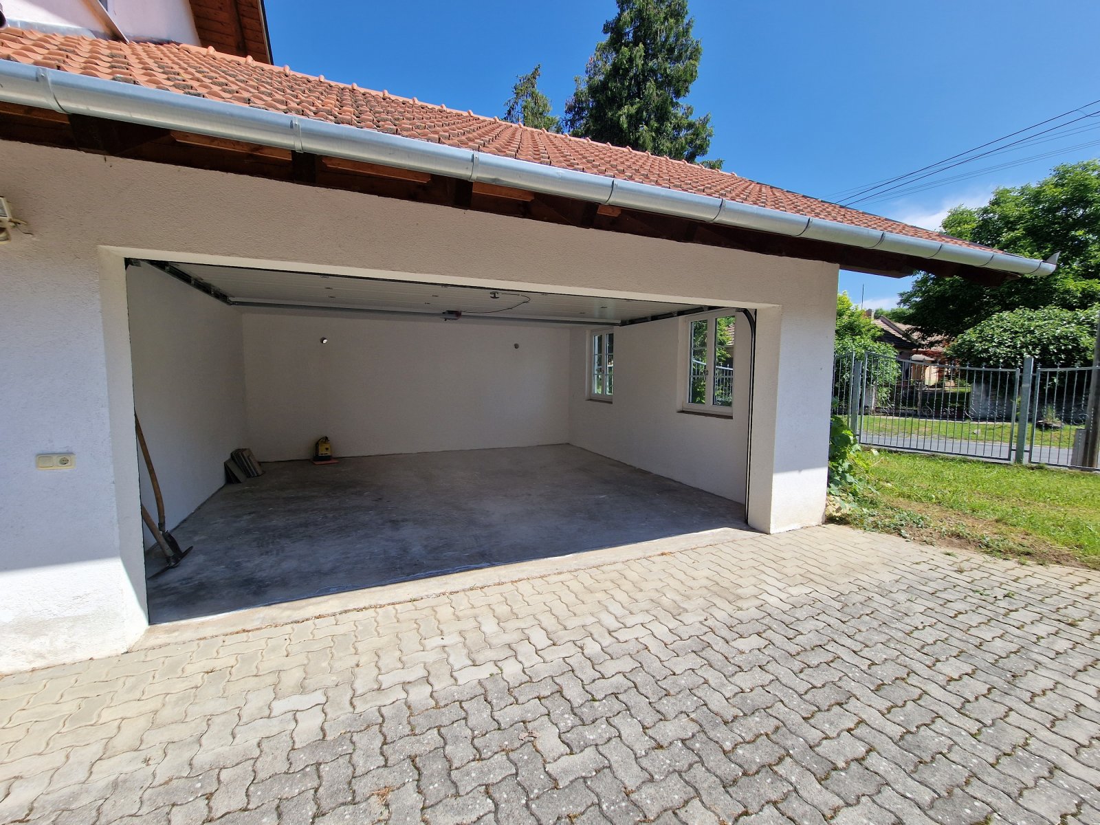 Una escalera de madera conduce a 2 habitaciones más y a un aseo en el ático. Toda la casa tiene un sótano de aprox. En el sótano hay varias habitaciones, una sala de calderas y un almacén de leña con bajada de leña desde el patio. Actualmente se utiliza como almacén de madera una dependencia de ladrillo con suelo de hormigón de unos 65 m². La propiedad incluye un garaje doble y otro garaje con trastero y entrada a la casa.
