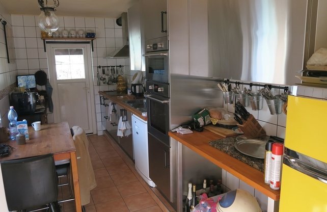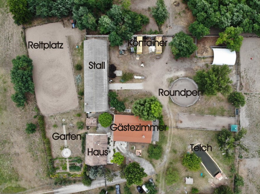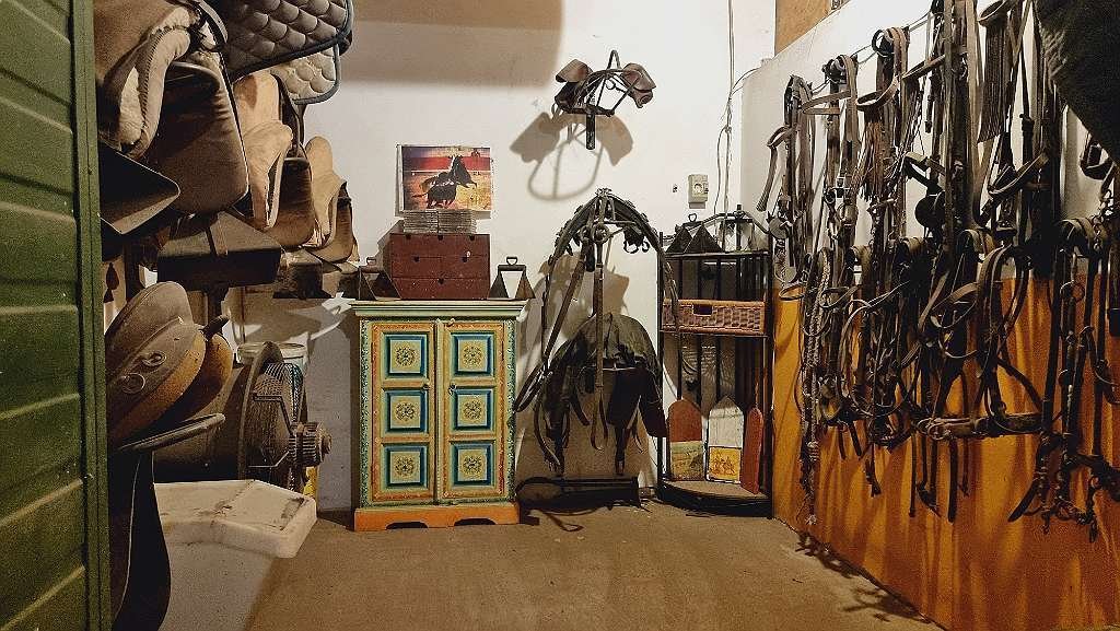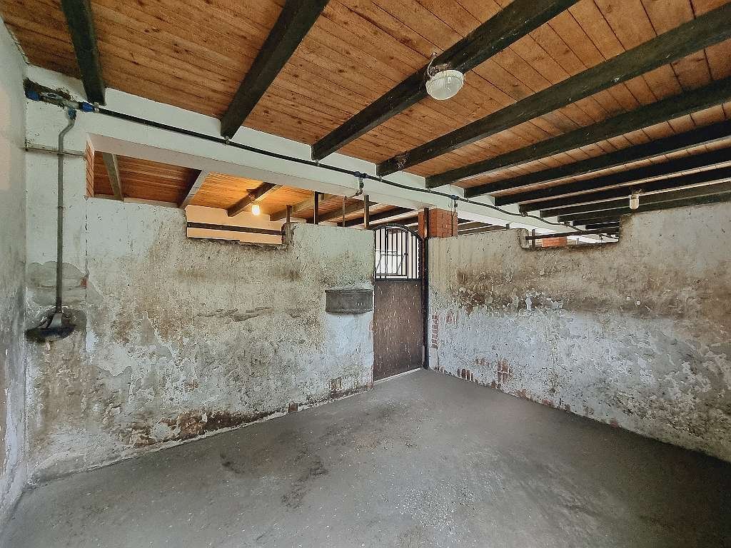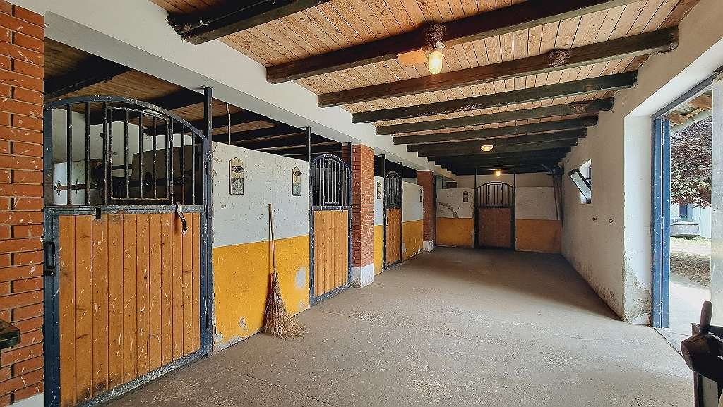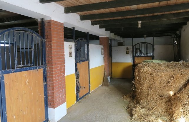 Edificio estable ça 280m2, con 5 boxes, cuarto de silla, lavadero de caballos, cuarto de ducha adicional con lavabo, calefacción de leña con ventilador para calentar el establo de caballos y amplio estudio / taller independiente con electricidad 230/380 V.