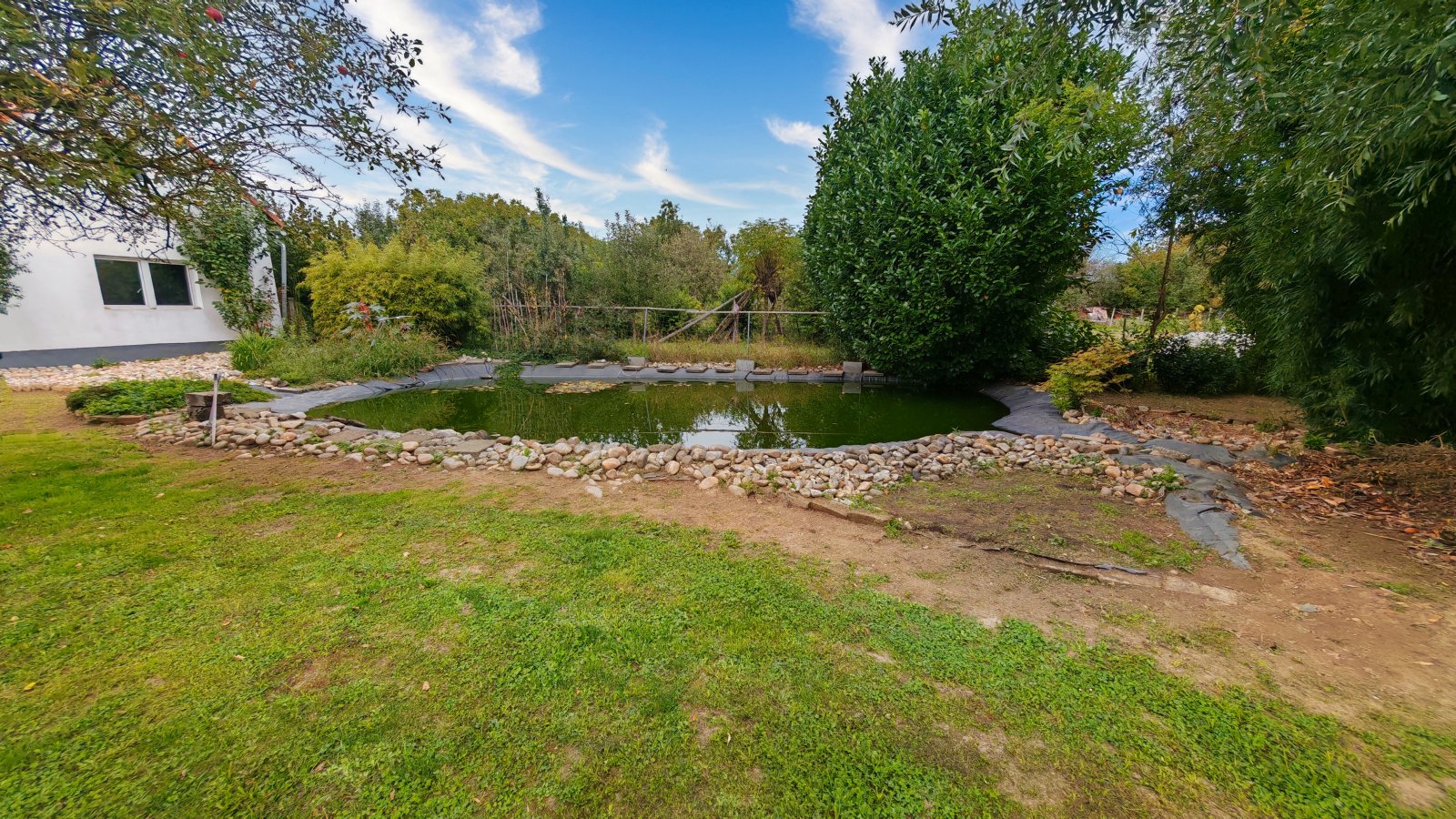 Amplia parcela (4800 m²) con estanque, parterres y árboles frutales.