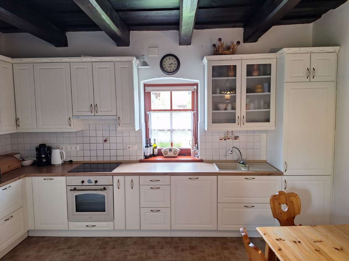 En un lavadero independiente, la calefacción central de la casa está conectada al horno de agua caliente, así como a un termo de 300 litros. Cuando hace buen tiempo, el agua para uso doméstico se genera mediante un colector solar, mientras que en invierno se genera mediante la estufa de leña.