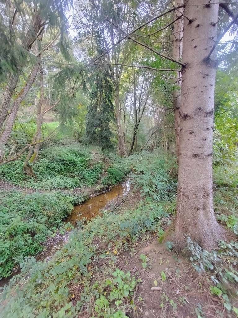 En la parte trasera de la propiedad se encuentran siete hermosos abetos, tras los cuales fluye el suave arroyo Törökbach. La propiedad tiene una distribución llana y favorable y actualmente alberga varios árboles frutales que se pueden plantar libremente para formar un huerto.
