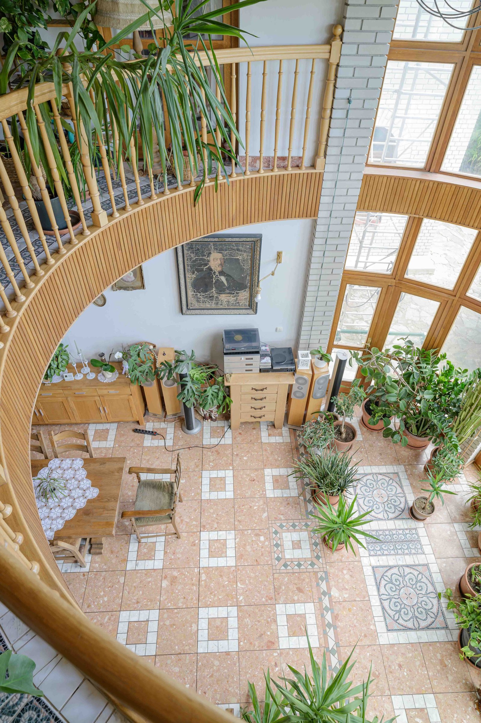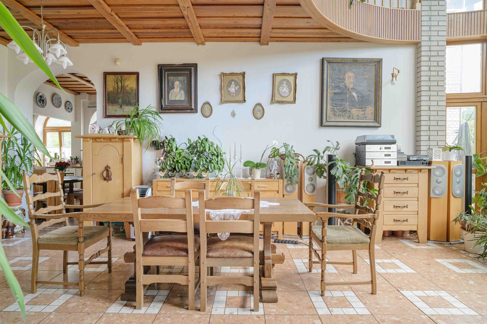 - Numerosas ventanas arqueadas de roble
