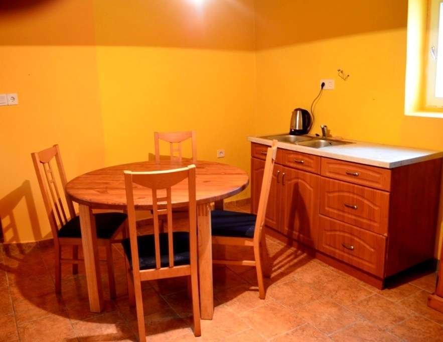 Cocina: 15 m², estufa de sobremesa, aparador, fregadero, mesa de roble.