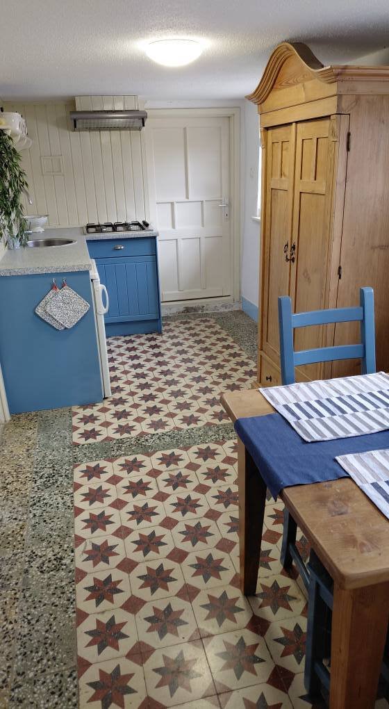 Una puerta corredera da acceso a la antigua casa de campo, que conserva elementos originales. Allí encontrarás una despensa/bodega, tres dormitorios, una cocina compacta con comedor y un baño. El dormitorio principal cuenta con una sauna de infrarrojos, que la propietaria desea conservar.