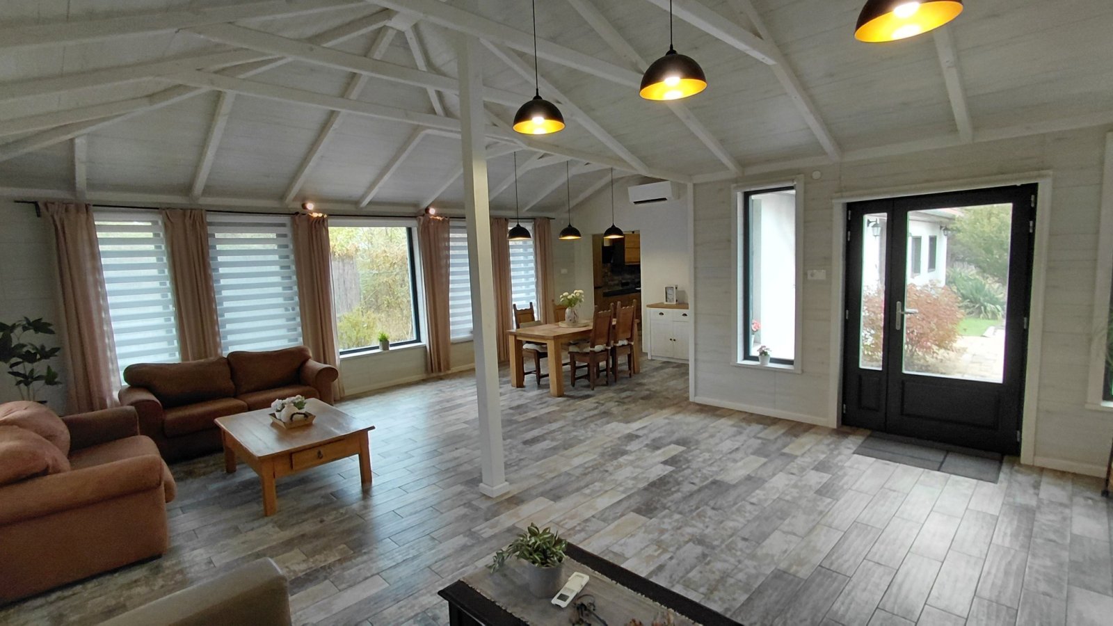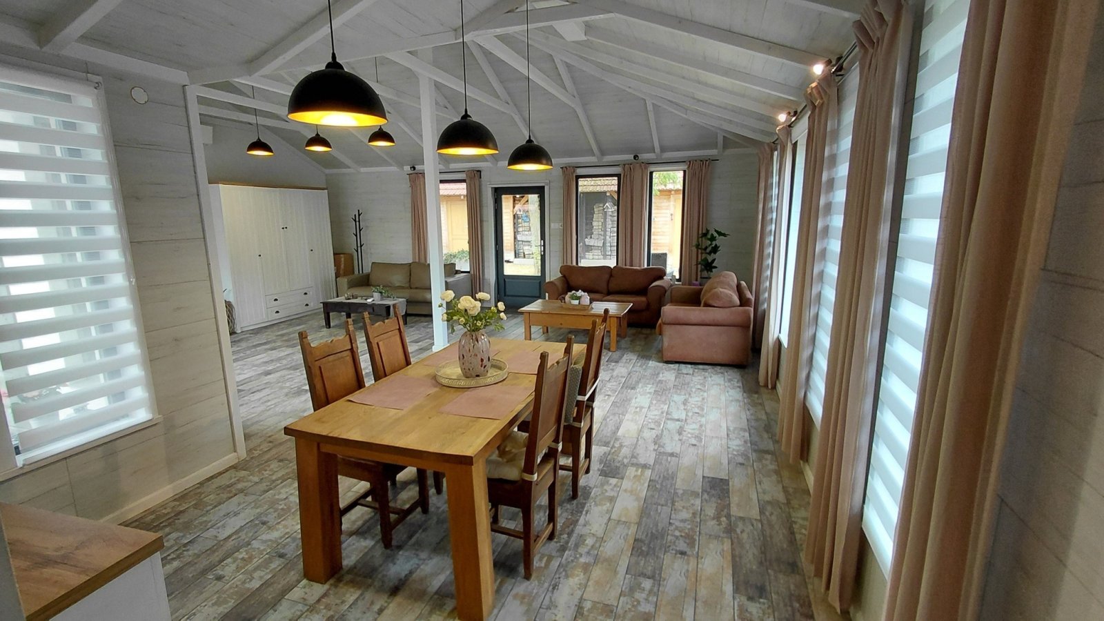 El recibidor conduce a un salón espacioso y confortable. Este salón, con estufa de leña, tiene una escalera que lleva a un ático con dos camas para invitados y espacio de almacenamiento adicional. El baño también es accesible desde el recibidor. ...``