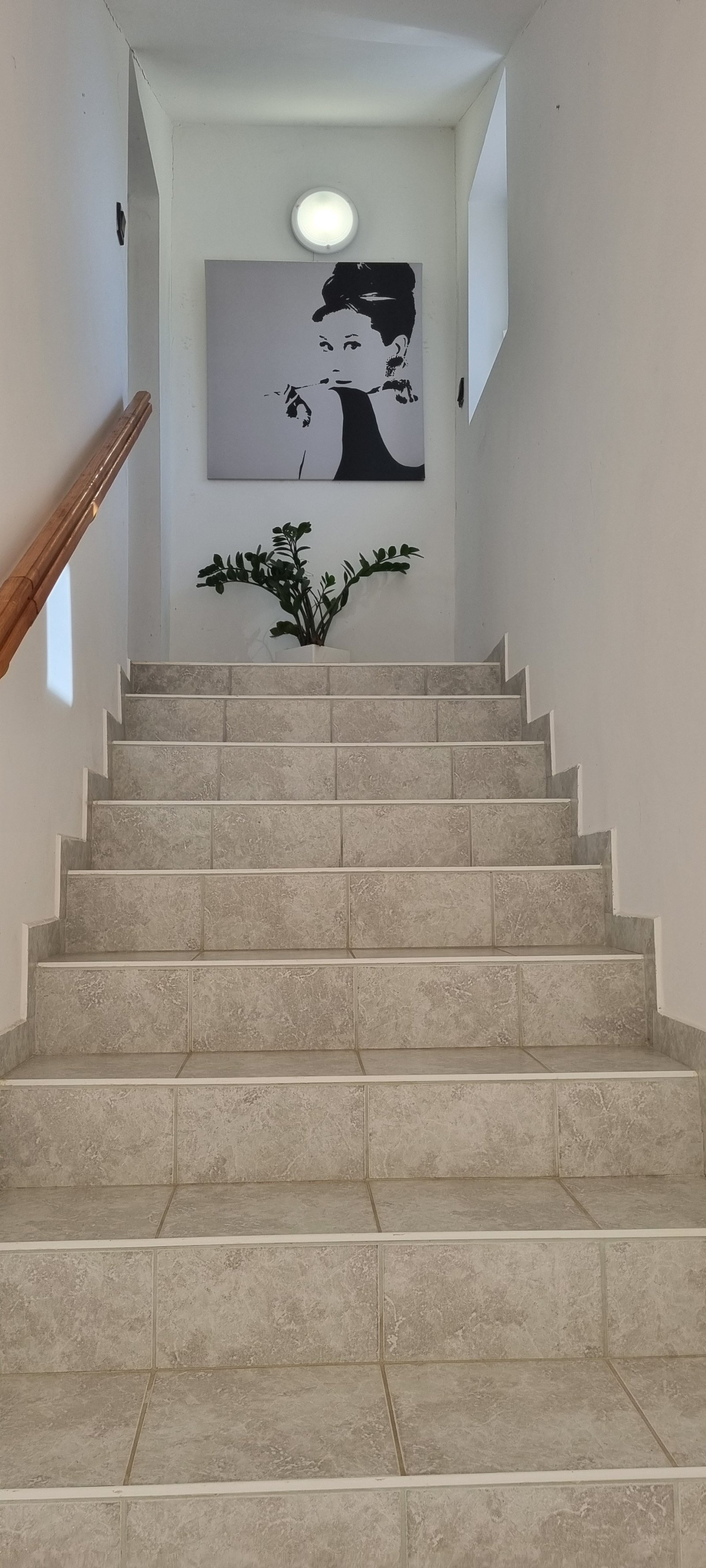 Desde el patio, una pequeña terraza conduce a una escalera con entrada independiente y cómodos escalones, que lleva al apartamento del primer piso. Las fotos tomadas desde el patio muestran claramente que la planta baja y el primer piso tienen entradas independientes. Por lo tanto, la casa es ideal para dos familias (o como vivienda multigeneracional).