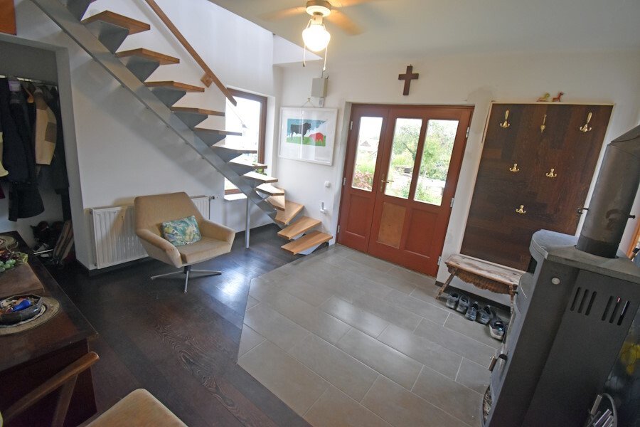 - Un recibidor con estufa de leña y una escalera abierta que conduce al ático