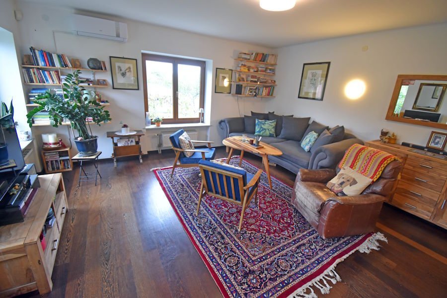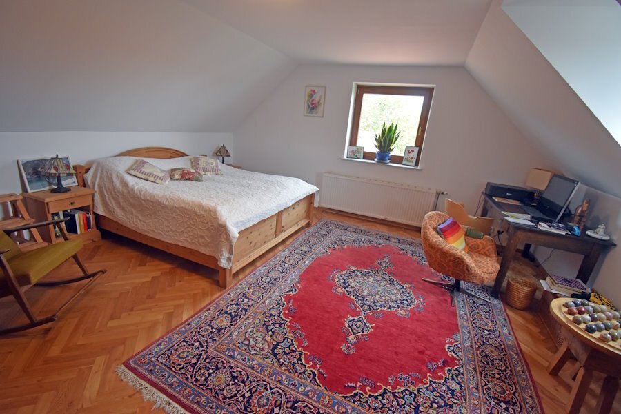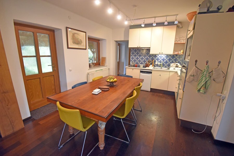 La dependencia tiene aproximadamente 120 m² de superficie útil, dividida en 4 habitaciones y un ático con galería. Puede utilizarse como taller y garaje, o convertirse en una casa completa con 2 apartamentos. También hay un ahumadero.