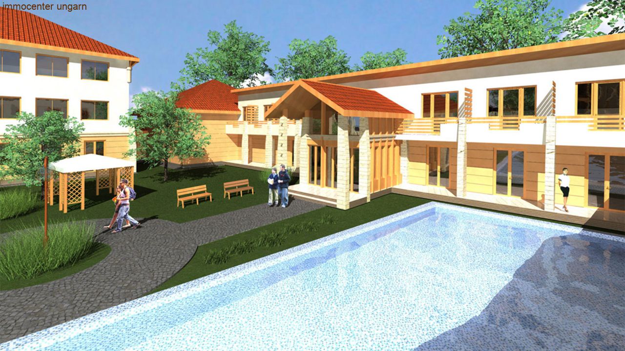 El lago Balaton a 300 m; Se proyectarán 38 apartamentos; en necesidad de renovación; Hay un puerto deportivo a 200 m. La cocina del restaurante tiene capacidad para 150 personas.