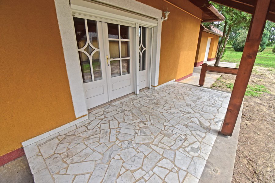 A házba fedett teraszon keresztül lehet bemenni, majd a folyosón/nappaliban van, innen nyílik 2 nagyobb és egy kisebb szoba, a zuhanyzó wc-vel és a konyha kamrával.