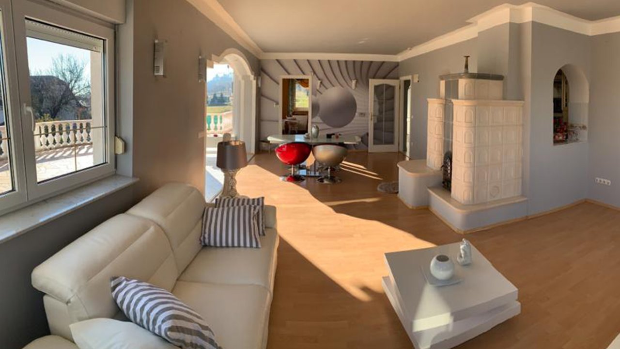 A nappali szinten egy nappali-étkező található kör alakú panorámás teraszokkal, az emeleten romantikus szobák fürdőszobával és terasszal. A házban gáz központi fűtés és cserépkályha is van.