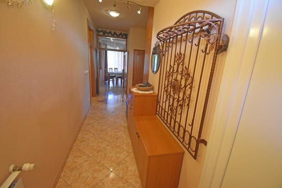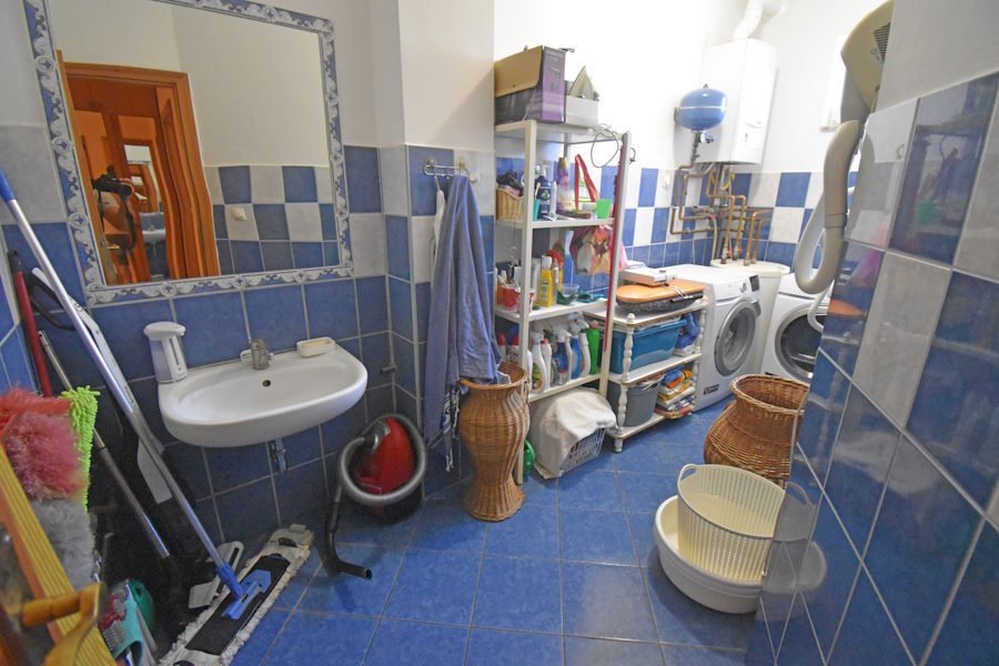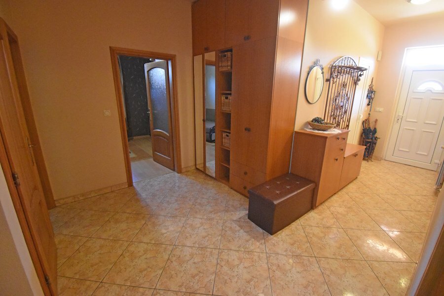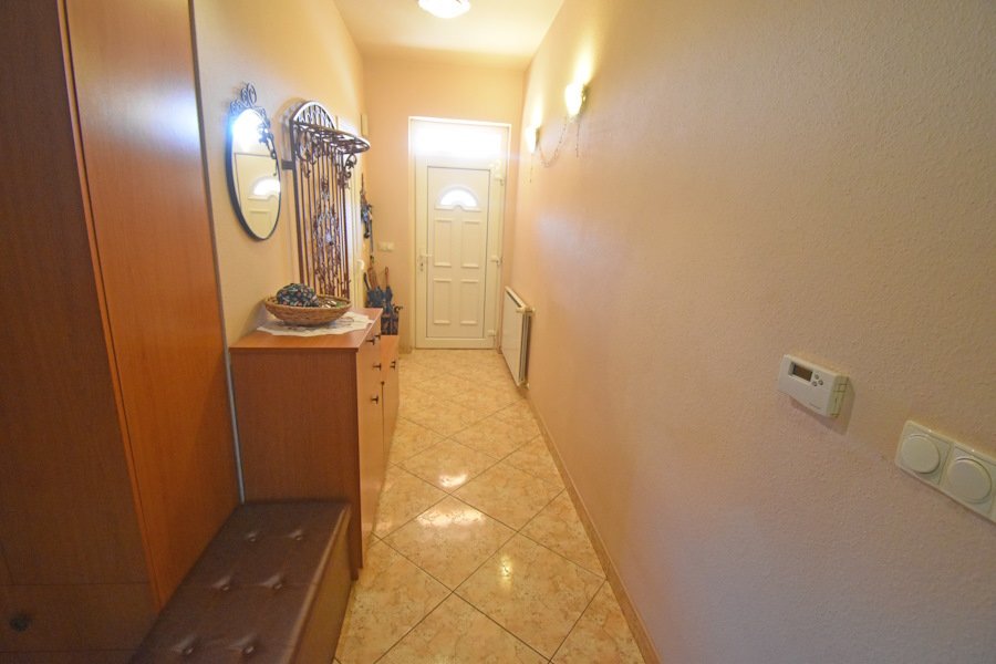A bejárati ajtó is ugyanebbe a folyosóra vezet. Tőle jobbra van egy előszoba, ahonnan a nappaliba jutunk, ami egy légtérben van a konyhával és az étkezővel. A kamra a konyhából nyílik. A folyosóról elérhető a vendég wc, a mosókonyha és a hálószoba.