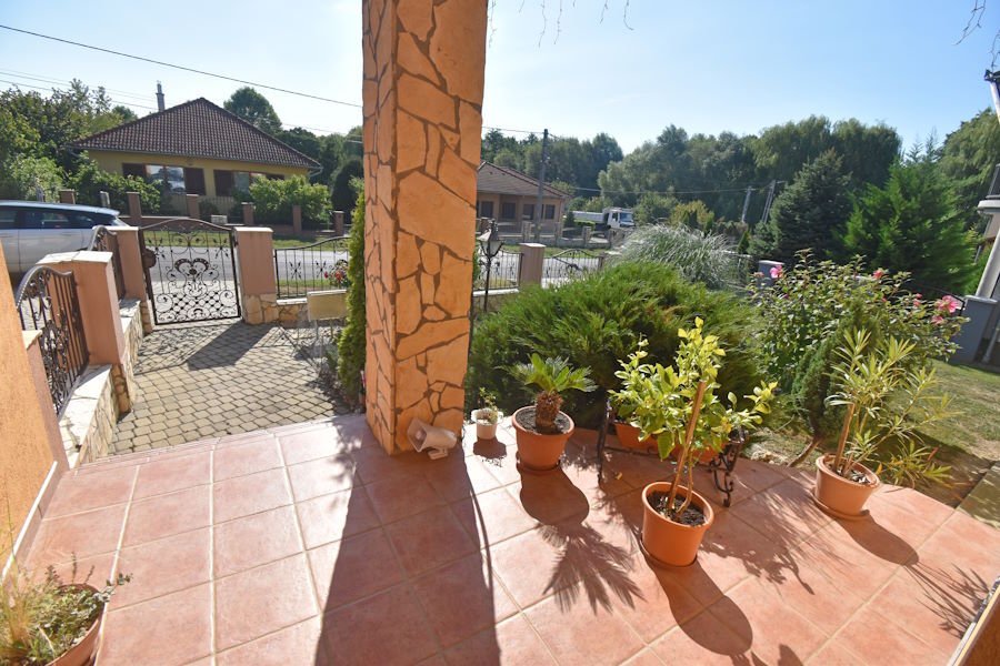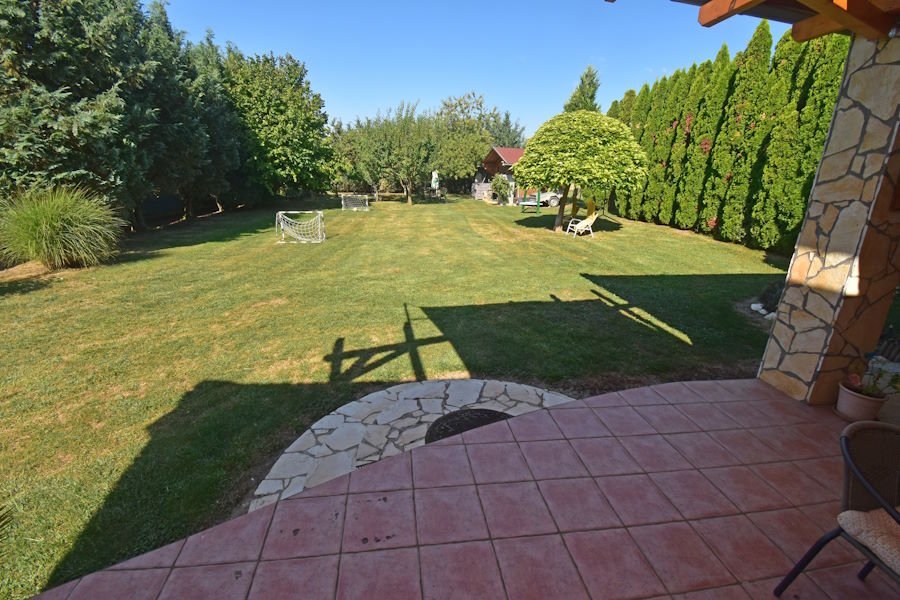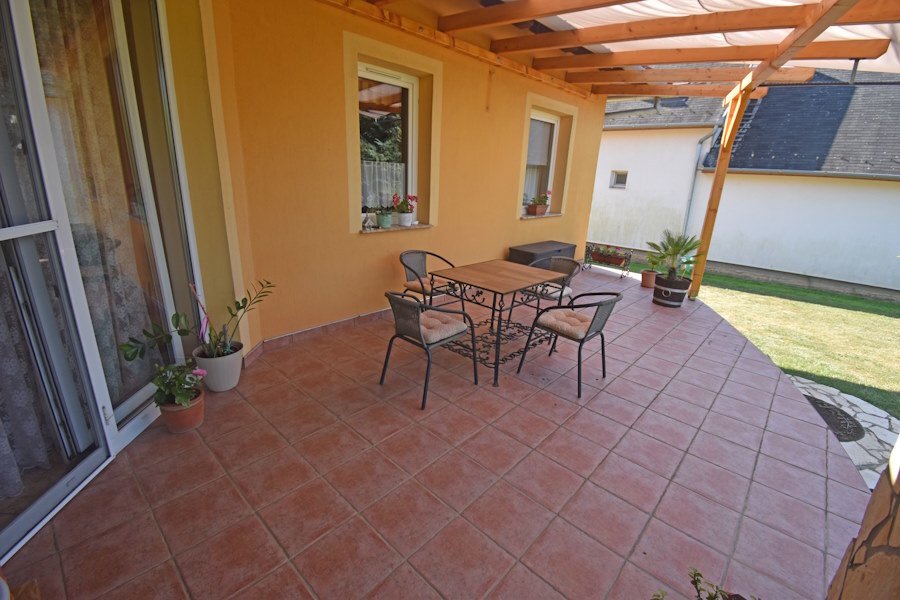 A nappali a teraszhoz kapcsolódik. Ez a terasz fedett, kb 24m2-es, ahonnan a gondozott, parkosított kertbe jutunk, ahol sok gyümölcsfa van: cseresznye, szilva, alma, barackfa, de málna, szeder, ribizli stb.
