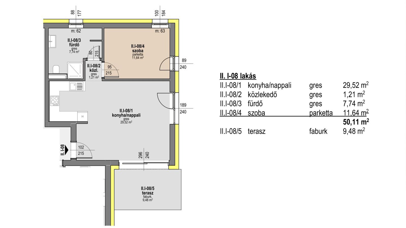 A lakáshoz tartozó terasz mérete 9,48 m2.