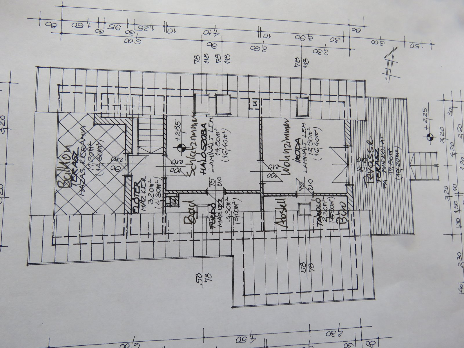 A földszint alapterülete a borospincével együtt kb. 90 m², az emelet alapterülete az építés alatt álló erkéllyel és terasszal együtt kb.