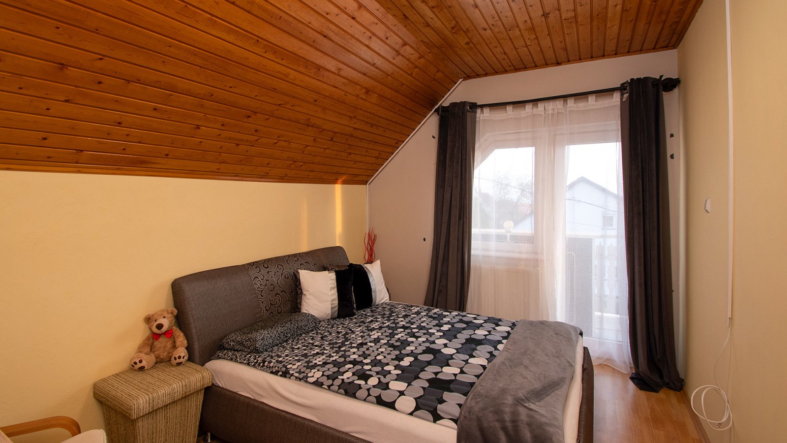 A felső szinten további négy hálószoba és két fürdőszoba található saját erkéllyel, részleges kilátással a Balatonra.