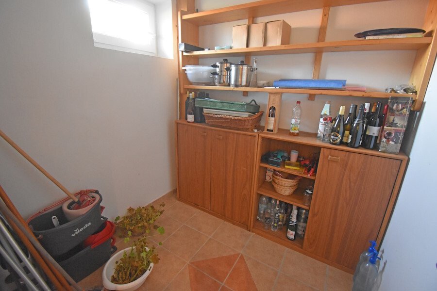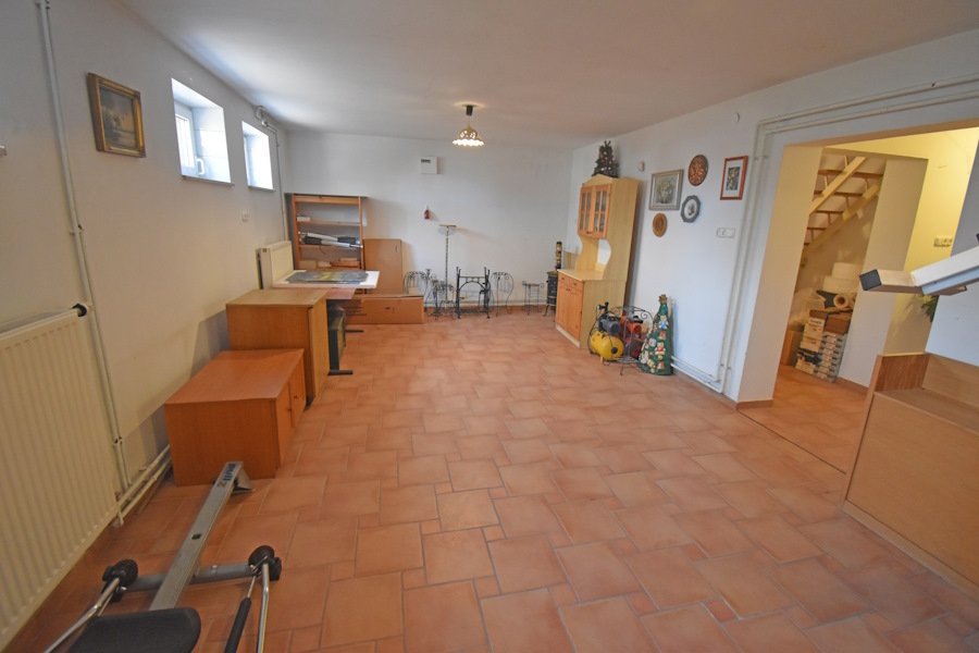A földszinti bejárati folyosón jutunk a 150 m²-es, dupla téglafalakkal és szigeteléssel ellátott pincébe. Itt található a kazánház, egy 12 m2-es fatároló, normál konyhává alakítható mosókonyha, 4 tároló helyiség, zuhanyzó, külön wc és a lépcsőház. Egyedi elképzelések szerint ez az emelet külön lakásként is kialakítható.